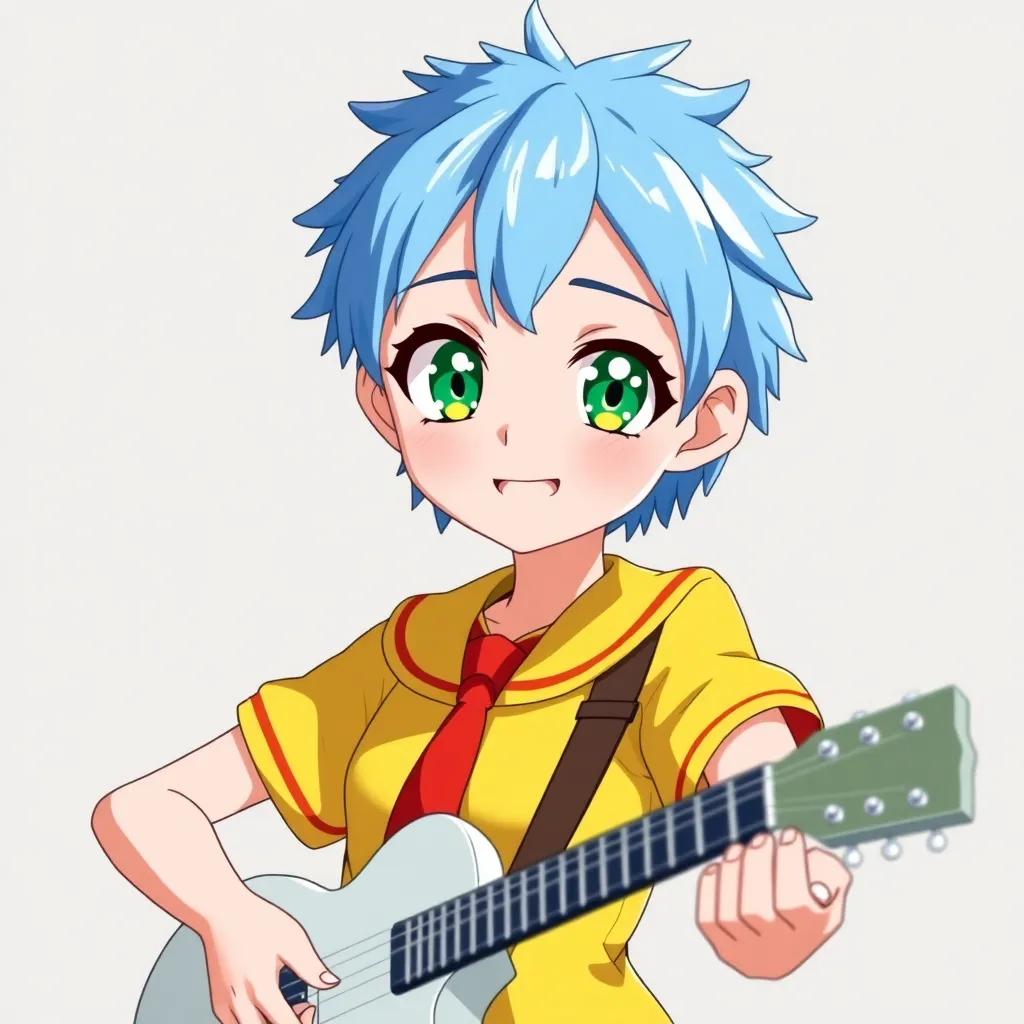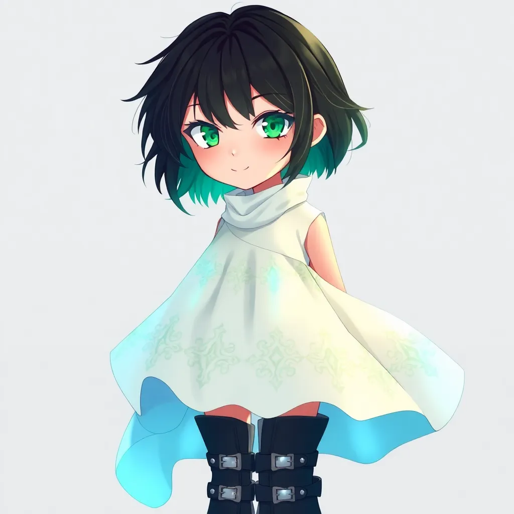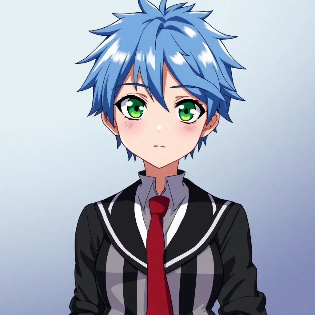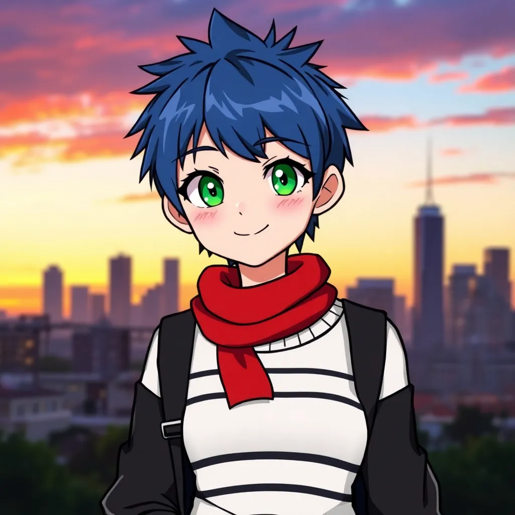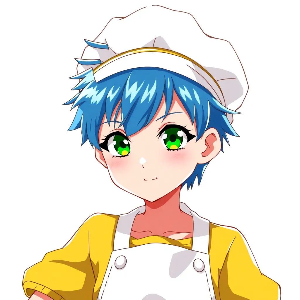 Create a futuristic anime character with a cyberpunk twist. Give them short, spiky blue hair and piercing green eyes. They should wear a sleek black jumpsuit with neon green accents and carry a high-tech staff that can transform into a variety of tools. The background should be a neon-lit cityscape.