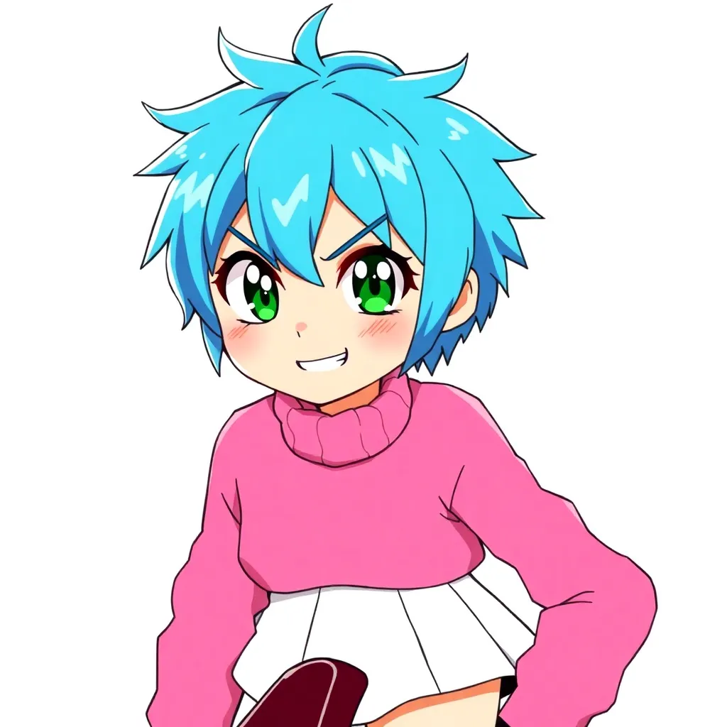 Create an anime character named 'Lumina' with a futuristic cyberpunk setting. She's a 17-year-old hacker with short, spiky blue hair and piercing green eyes. Her outfit consists of a black leather jacket, ripped jeans, and combat boots. Give her a confident and determined expression, with a hint of mischief.