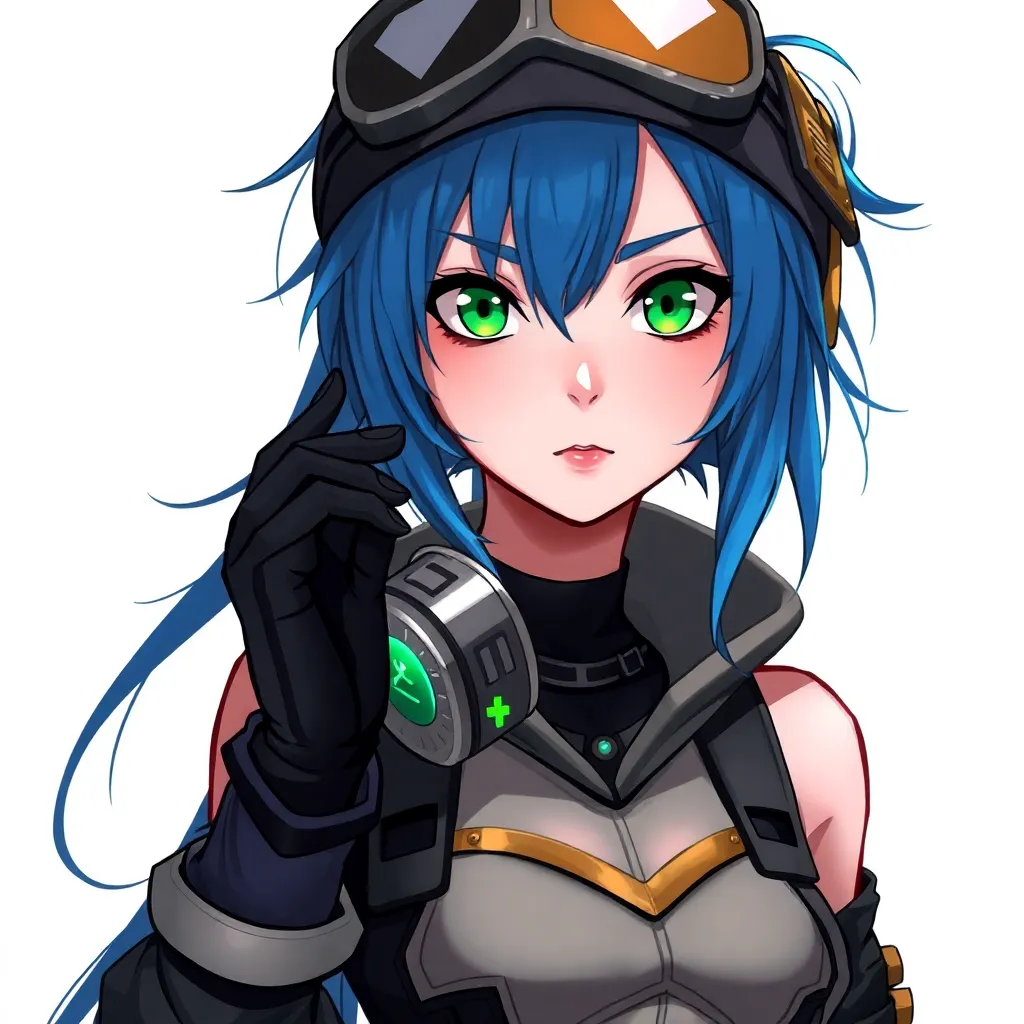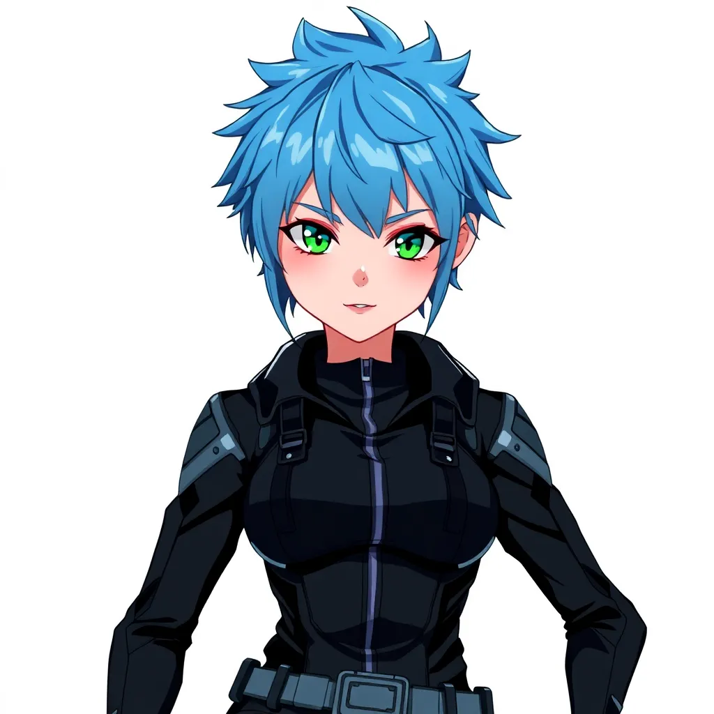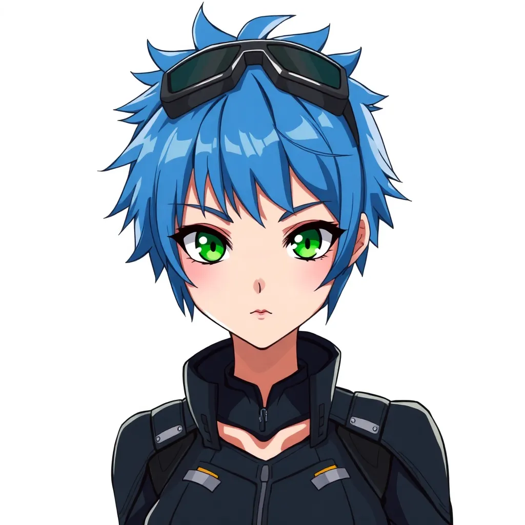 Create a unique anime character with a futuristic cyberpunk aesthetic. Design a young woman with short, spiky blue hair and piercing green eyes. She wears a sleek black jumpsuit with metallic accents and has a pair of high-tech goggles perched on her forehead. Give her a confident and determined expression.