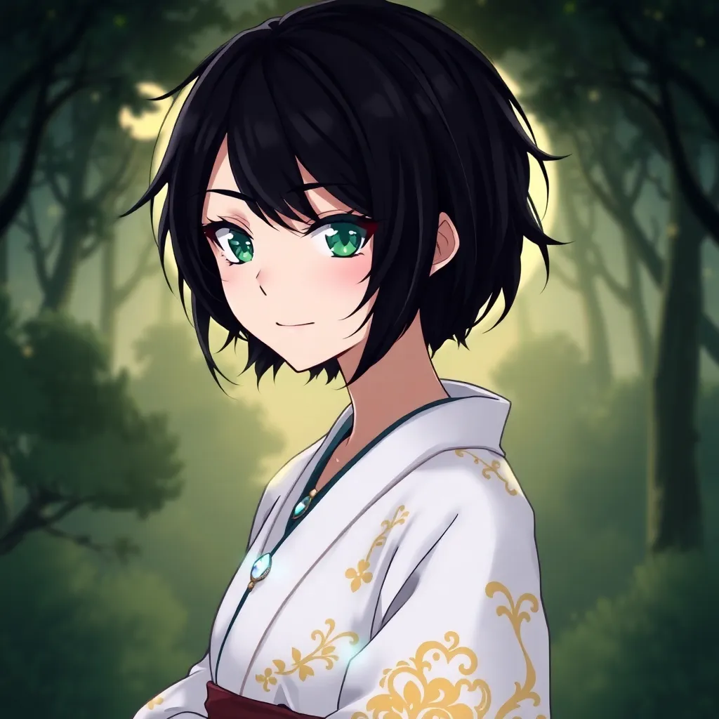 Create a mystical anime character named 'Kokoro' with piercing emerald eyes, raven-black hair styled in a messy bob, and a gentle smile. She wears a flowing white kimono with intricate golden embroidery, accompanied by a delicate silver necklace adorned with a small, glowing moonstone. Her background is a serene, moonlit forest.