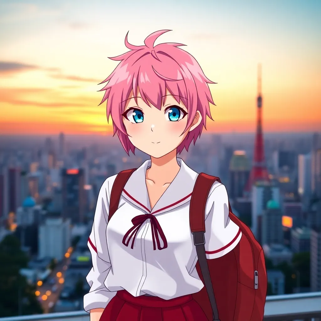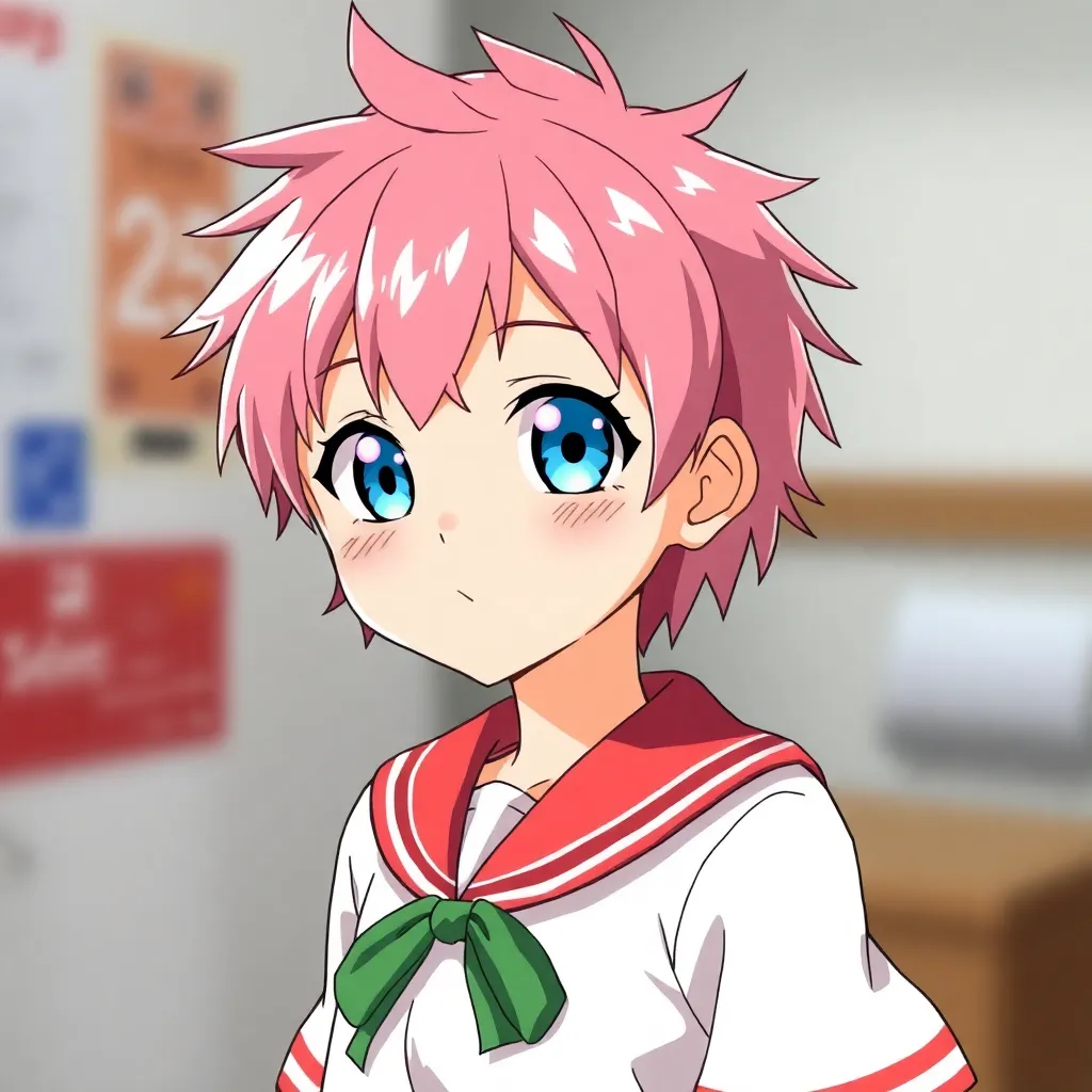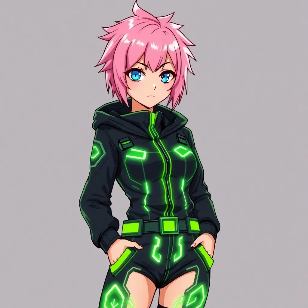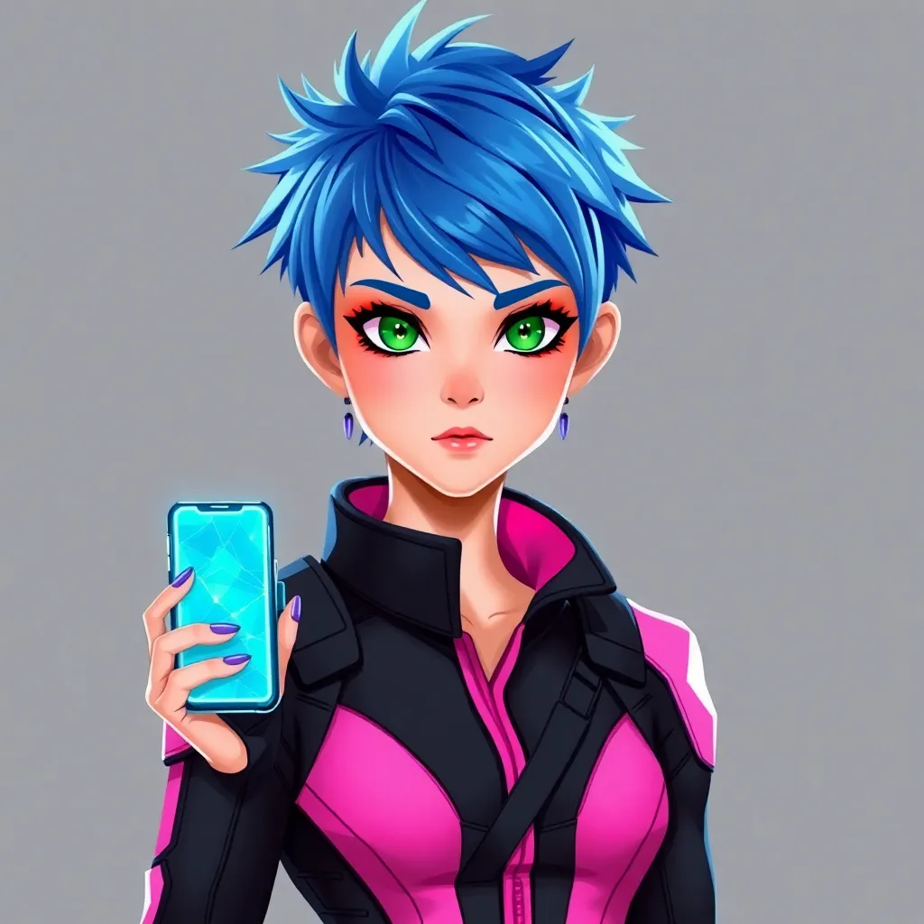 Create a futuristic high school student with short, spiky blue hair and piercing green eyes. She wears a sleek black and neon pink jumpsuit with a utility belt and has a holographic smartphone attached to her wrist. Give her a confident and determined expression, as if she's ready to take on the world.