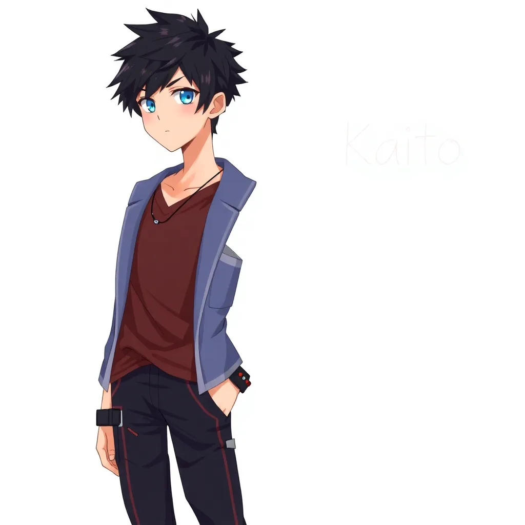 Create a anime-inspired character with a mysterious aura. Design a young adult with short, spiky black hair and piercing emerald green eyes. Their outfit consists of a black and purple kimono with a high collar, worn over a white shirt and high-waisted pants. Add a silver crescent moon pendant around their neck.