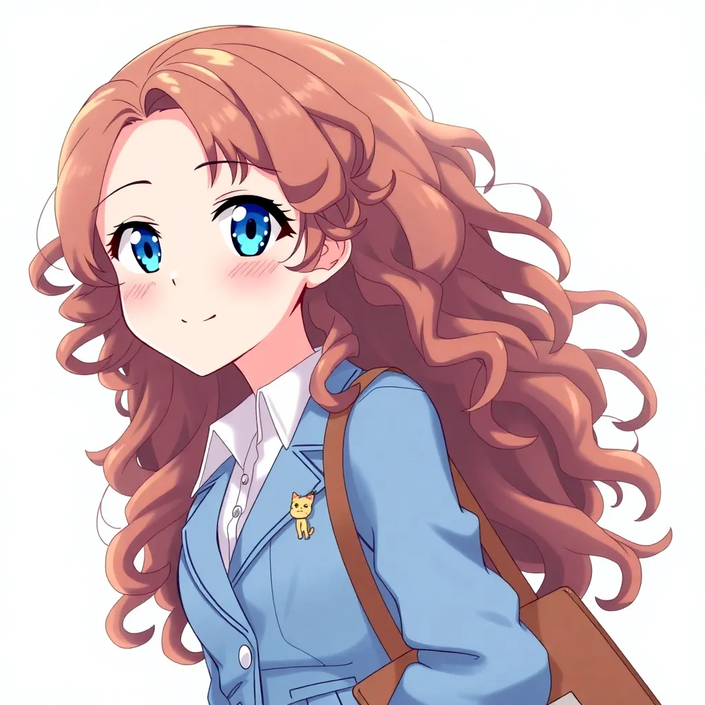 Create a vibrant anime character inspired by the magical world of 'Fullmetal Alchemist'. The character, a young woman with short, spiky hair and piercing blue eyes, wears a flowing white cloak with intricate golden trim, and carries a staff adorned with glowing gemstones. Her expression is a mix of determination and curiosity.