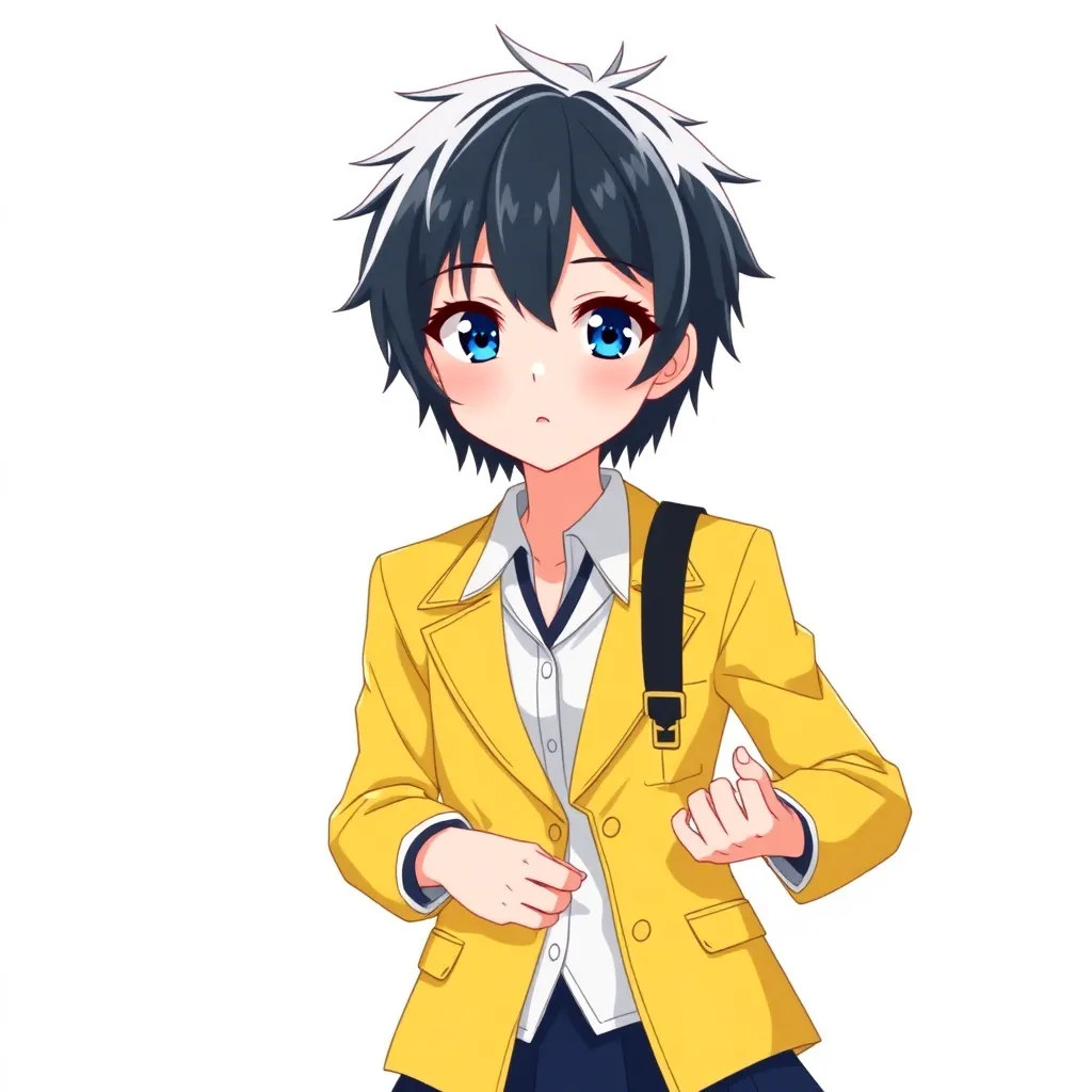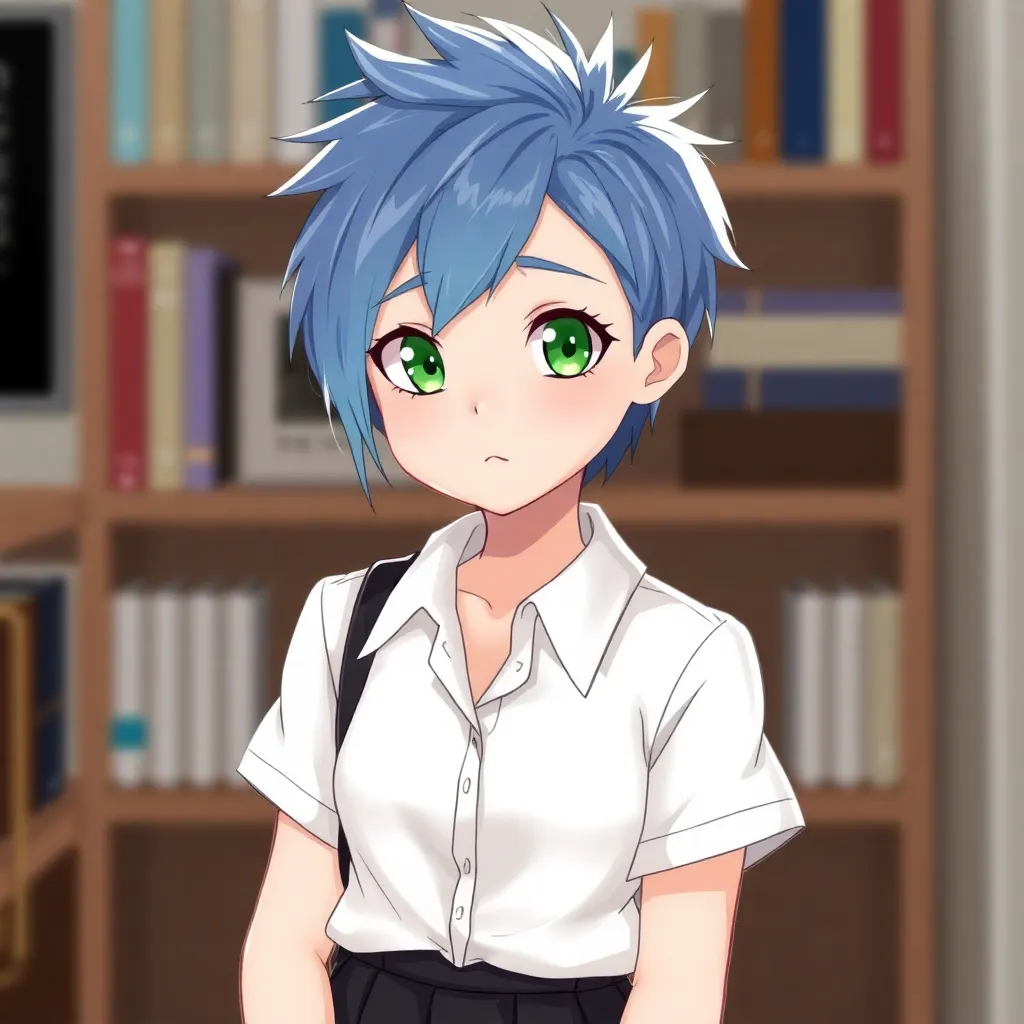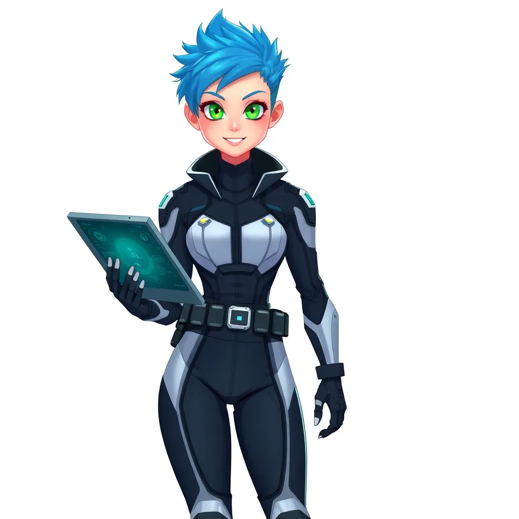Create a futuristic high school student with short, spiky blue hair and piercing green eyes. She wears a sleek black and silver jumpsuit with a utility belt and carries a futuristic smartphone. Her personality is bubbly and outgoing, with a passion for robotics and inventing. Generate an anime-style character image.