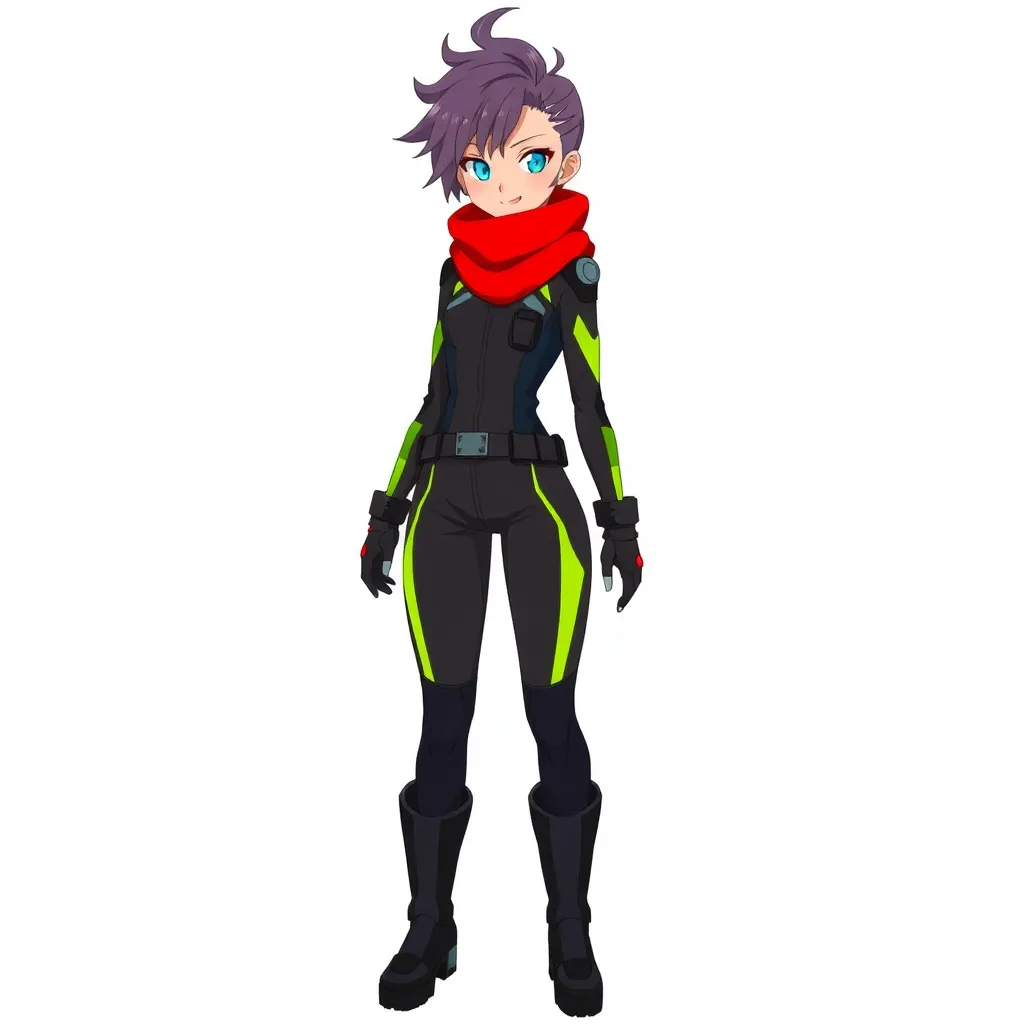 Create an anime character with a futuristic sci-fi setting. Design a young female protagonist with short, spiky blue hair and piercing green eyes. She wears a sleek black jumpsuit with silver accents and carries a high-tech staff that shoots energy blasts. Give her a confident and determined expression.