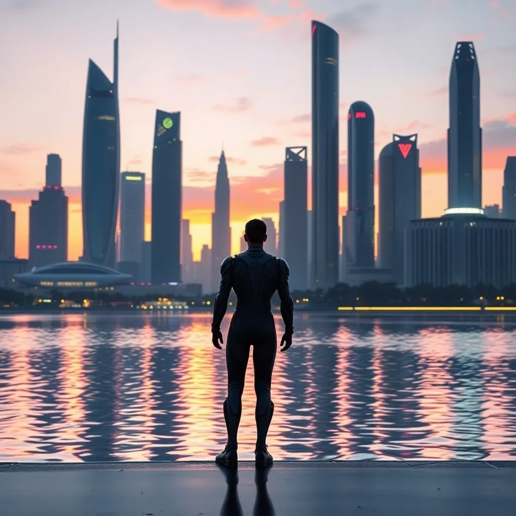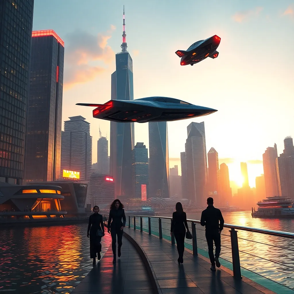 Create a futuristic cityscape at sunset, with towering skyscrapers and neon lights reflecting off the water. Incorporate a flying car soaring above the city, with a group of people in futuristic attire walking along the waterfront, enjoying the vibrant atmosphere and spectacular view. Add a hint of sci-fi elements.