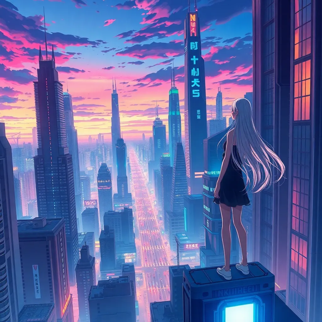 Create a breathtaking anime-style illustration of a futuristic cityscape at dusk, with towering skyscrapers and neon-lit streets. Incorporate a lone figure, a young woman with long, flowing silver hair, standing atop a building, gazing out at the city with a sense of wonder and determination. Use vibrant colors and dynamic lighting.