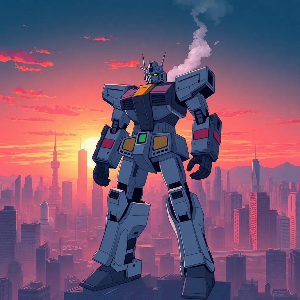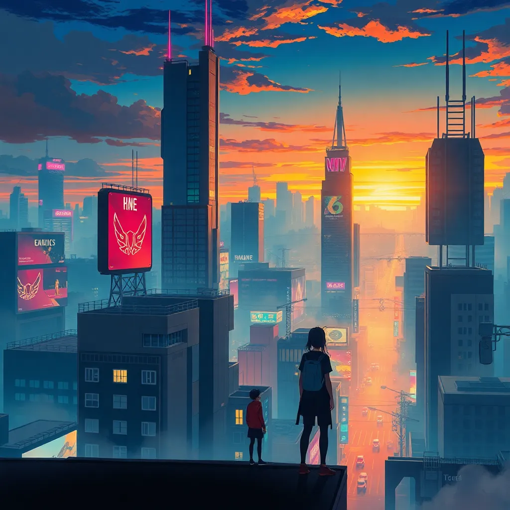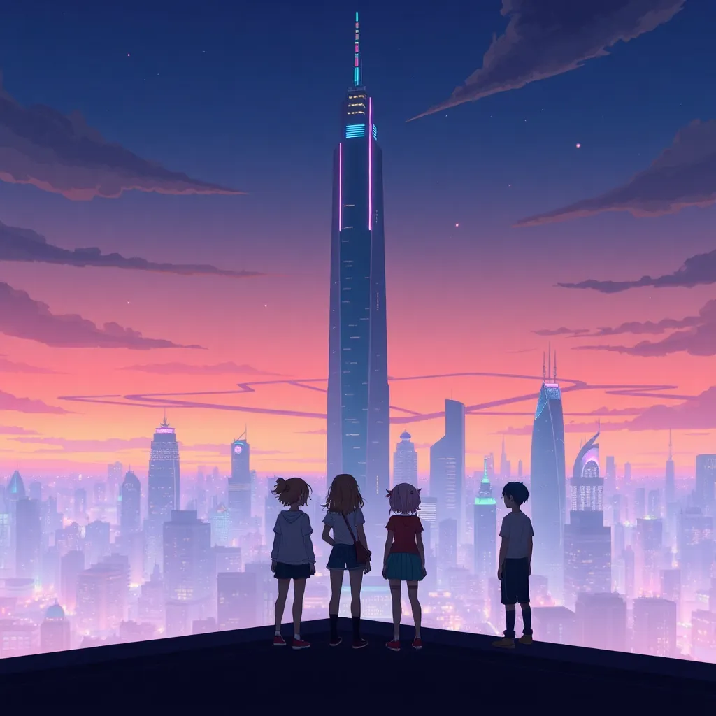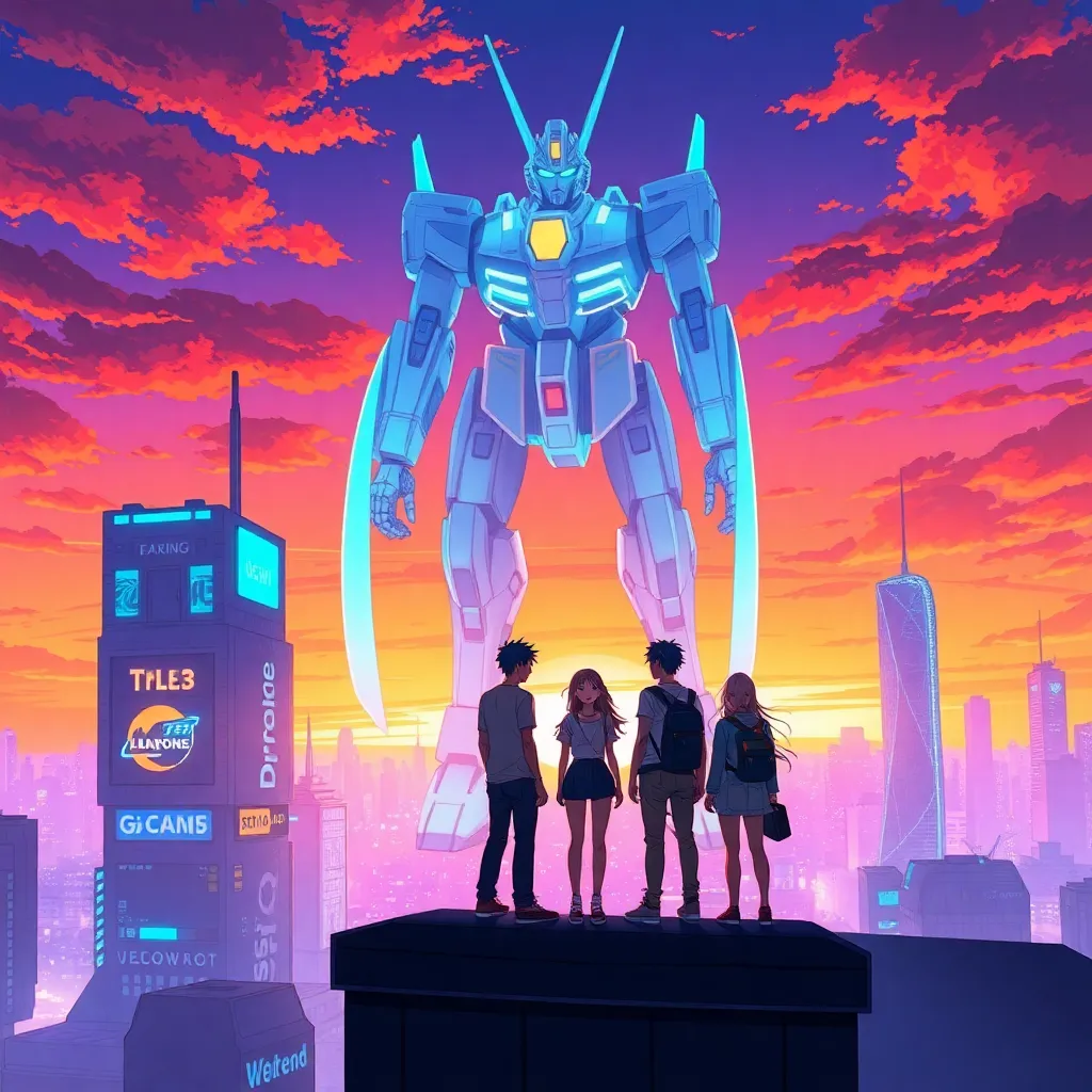 Create an anime-style illustration of a futuristic cityscape at sunset, featuring a group of friends (2 males and 2 females) standing on the rooftop of a skyscraper, surrounded by holographic advertisements and neon lights, with a giant robot looming in the distance, amidst a vibrant orange and purple sky.