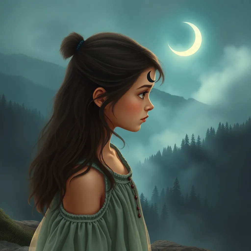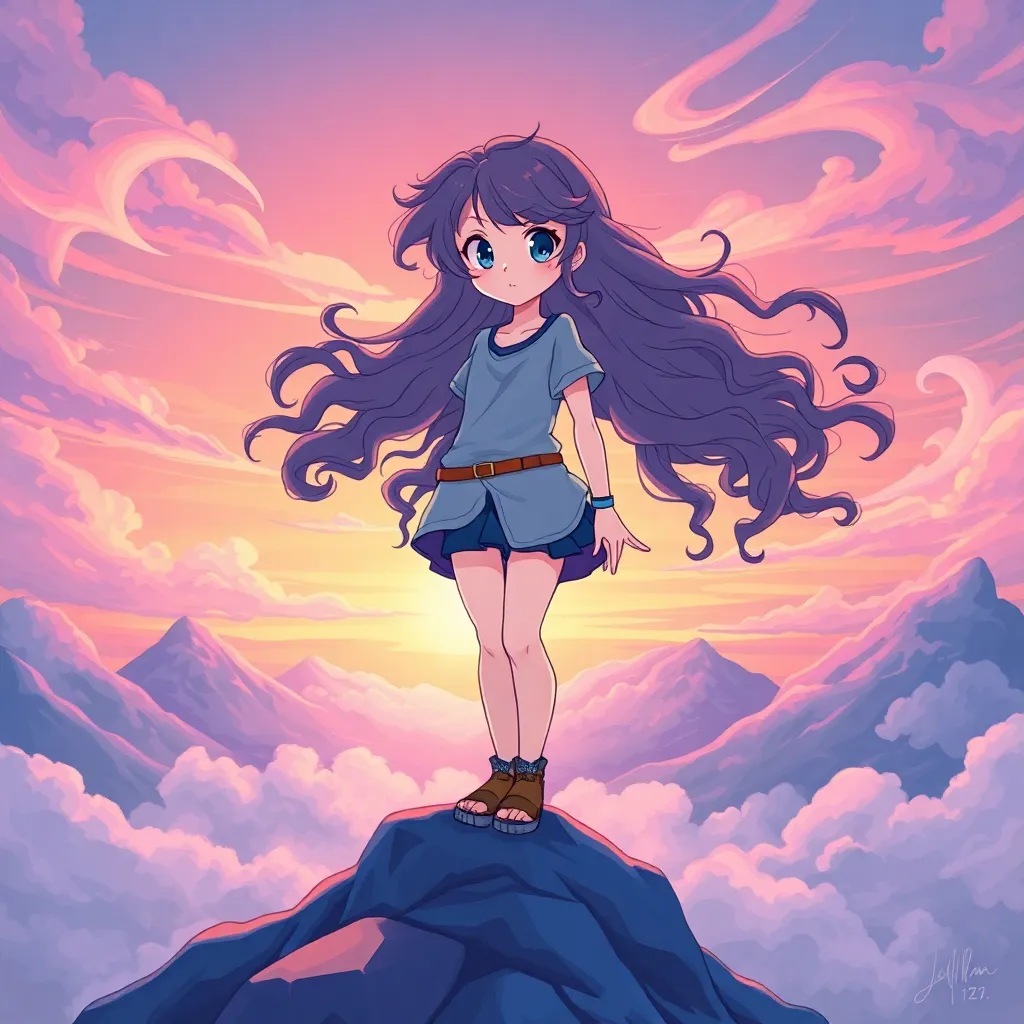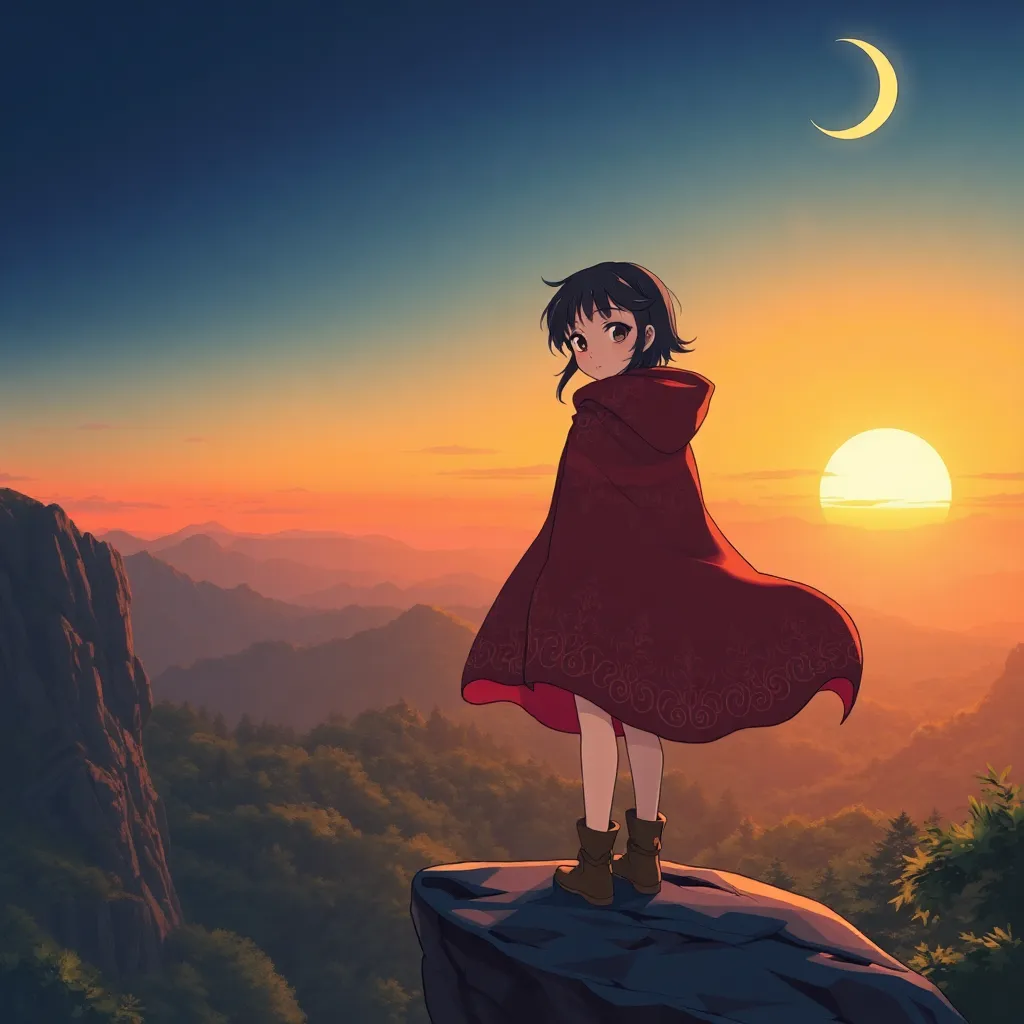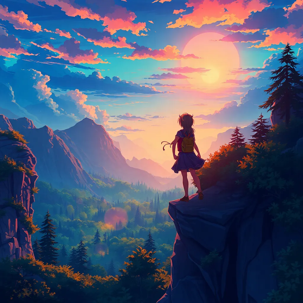 Create an anime-style illustration of a young, adventurous girl named Akira, standing on a cliff overlooking a vast, mystical forest at sunset. She wears a flowing cloak with intricate patterns, and has a determined expression on her face. Incorporate subtle magical sparks and a crescent moon in the background.