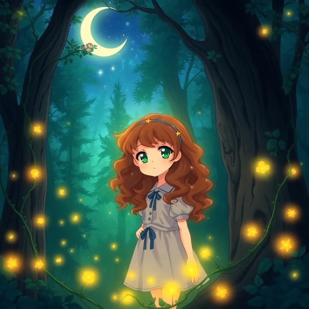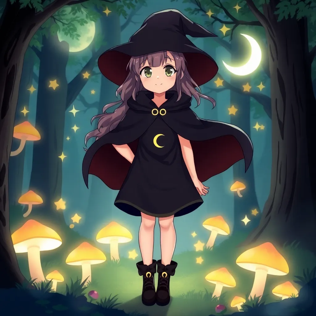 Create a vibrant anime-style illustration of a young witch named Luna standing in a mystical forest, surrounded by glowing mushrooms and twinkling stars. She's wearing a flowing black cloak with a crescent moon emblem, and has a mischievous grin on her face. Incorporate subtle magic sparks and a crescent moon glow.