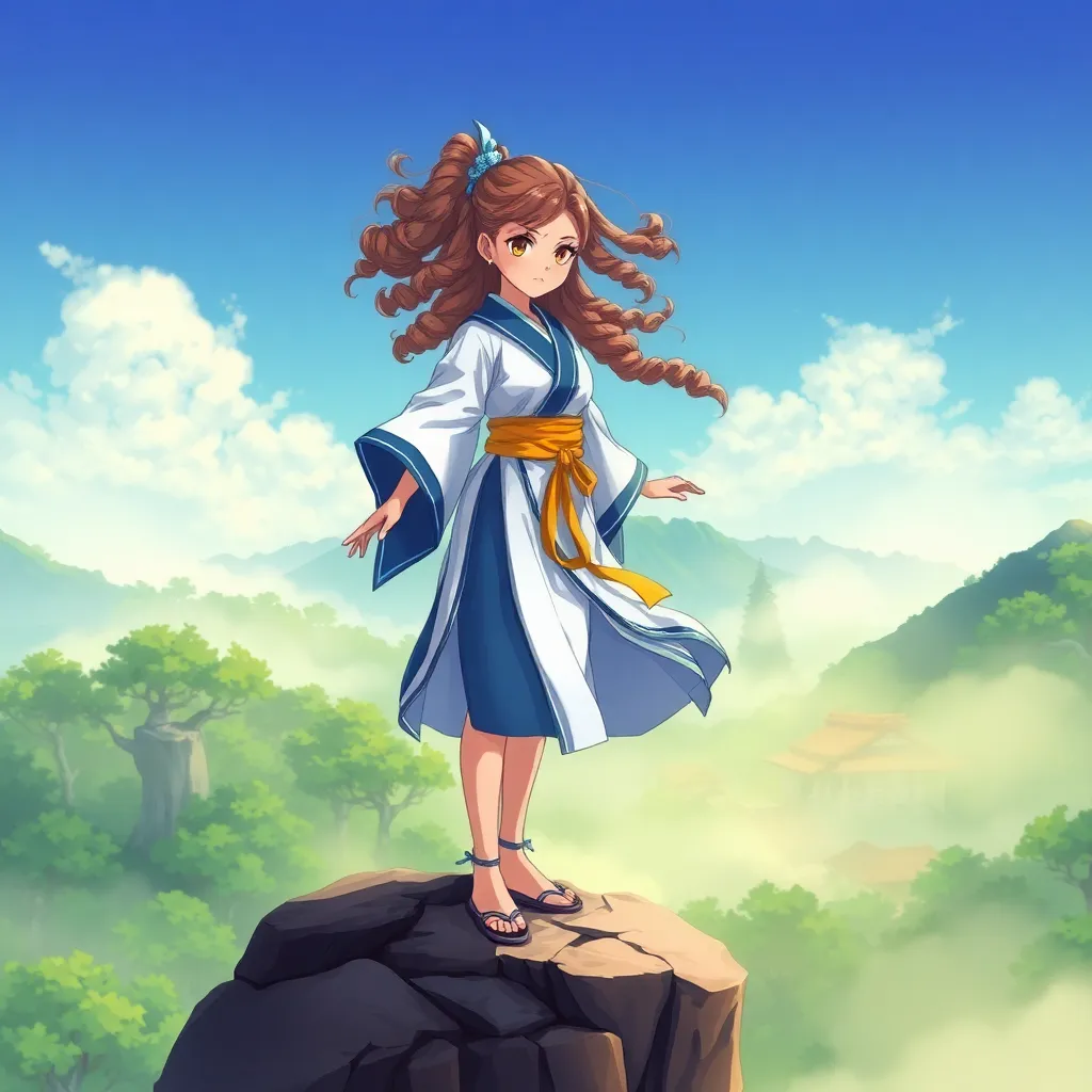 Create an anime-style illustration of a young, spirited warrior girl named 'Akira' standing proudly on a rocky cliff overlooking a serene, misty forest. She wears a flowing white and blue kimono with a golden sash, and her long, curly hair flows in the wind. Incorporate vibrant colors and dynamic poses.
