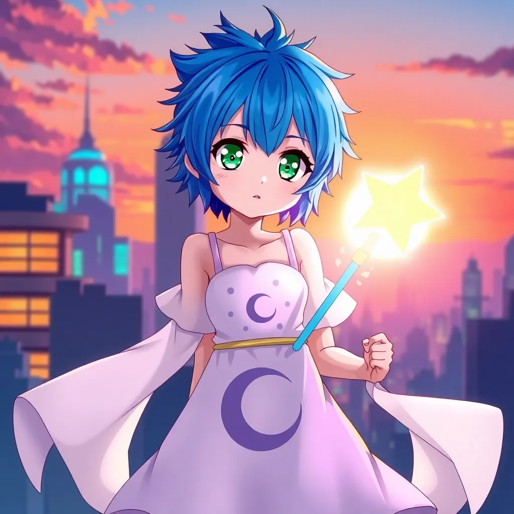 Create an anime-style illustration of a young girl with short, spiky blue hair and bright green eyes, standing in front of a futuristic cityscape at sunset. She's wearing a flowing white dress with a crescent moon pattern and holding a glowing, star-shaped staff. Incorporate vibrant colors and dynamic lighting.