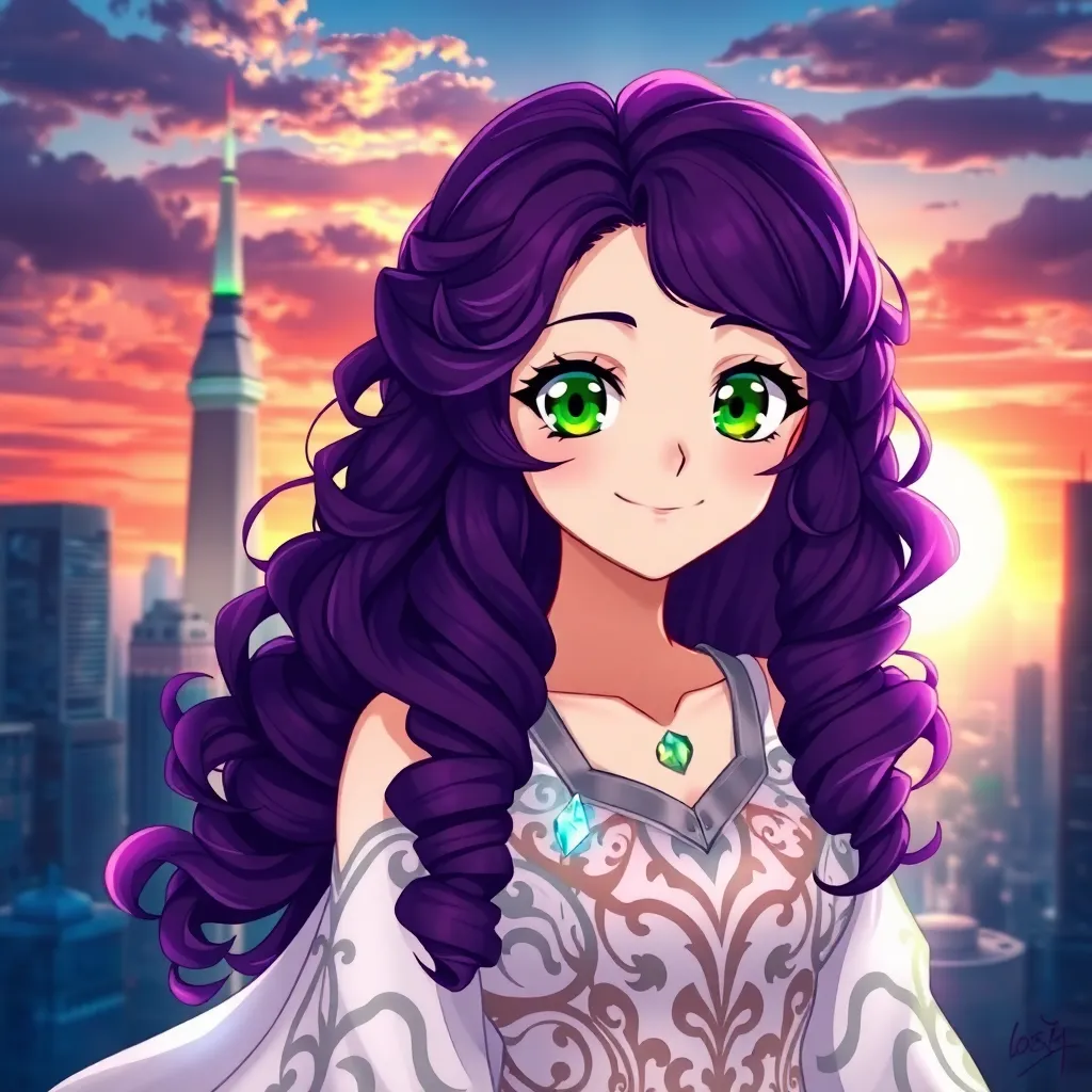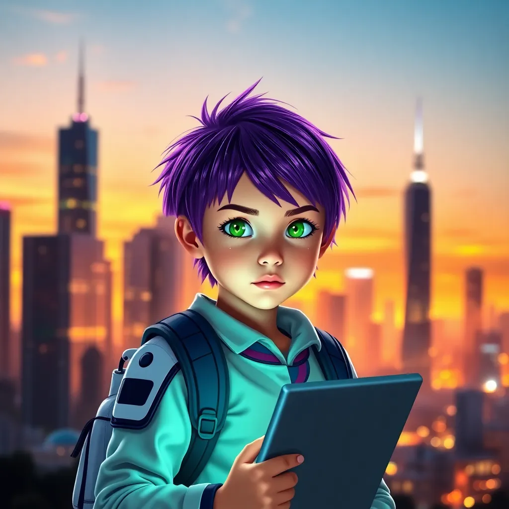 A young girl with short, spiky purple hair and bright green eyes, wearing a futuristic school uniform with a robotic backpack, stands in front of a gleaming cityscape at sunset. She's holding a glowing tablet and has a determined expression on her face, ready to save the world from an alien invasion.