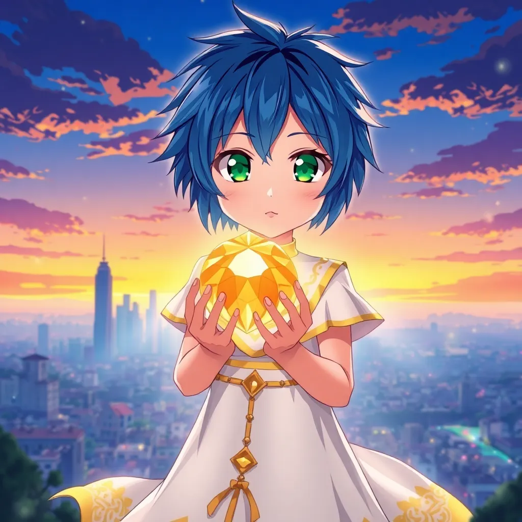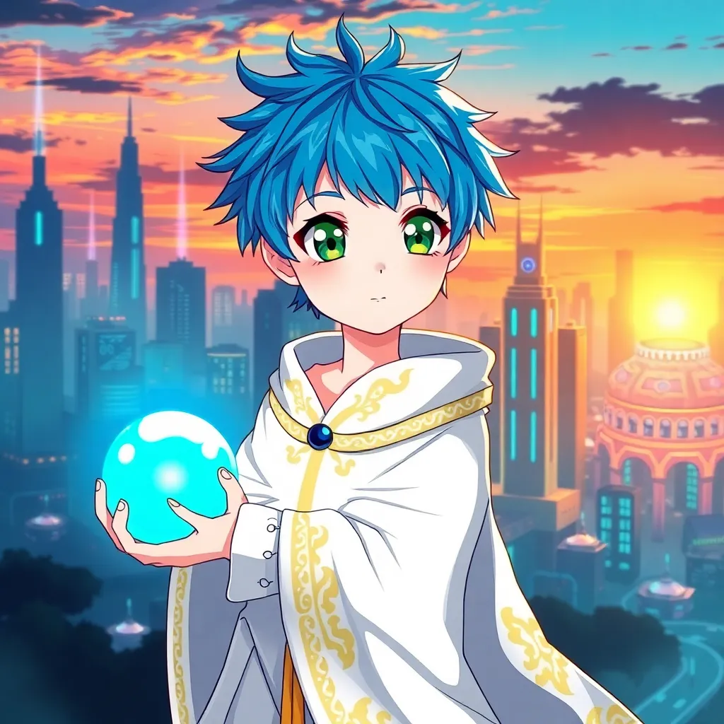 Create an anime-style illustration of a young girl with short, spiky blue hair and bright green eyes, standing in front of a futuristic cityscape at sunset. She's wearing a flowing white cloak with intricate golden patterns and holding a glowing blue orb. Incorporate neon lights and holographic projections in the background.