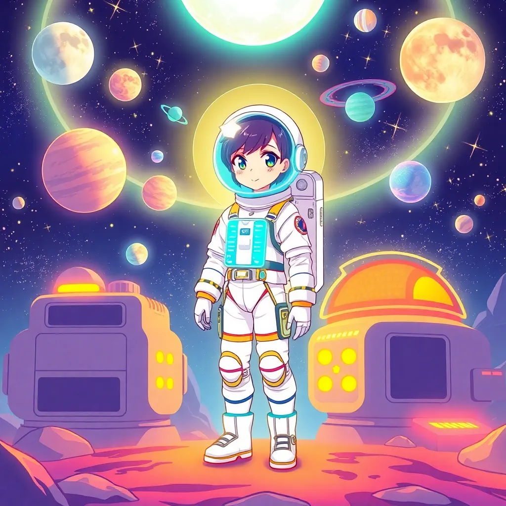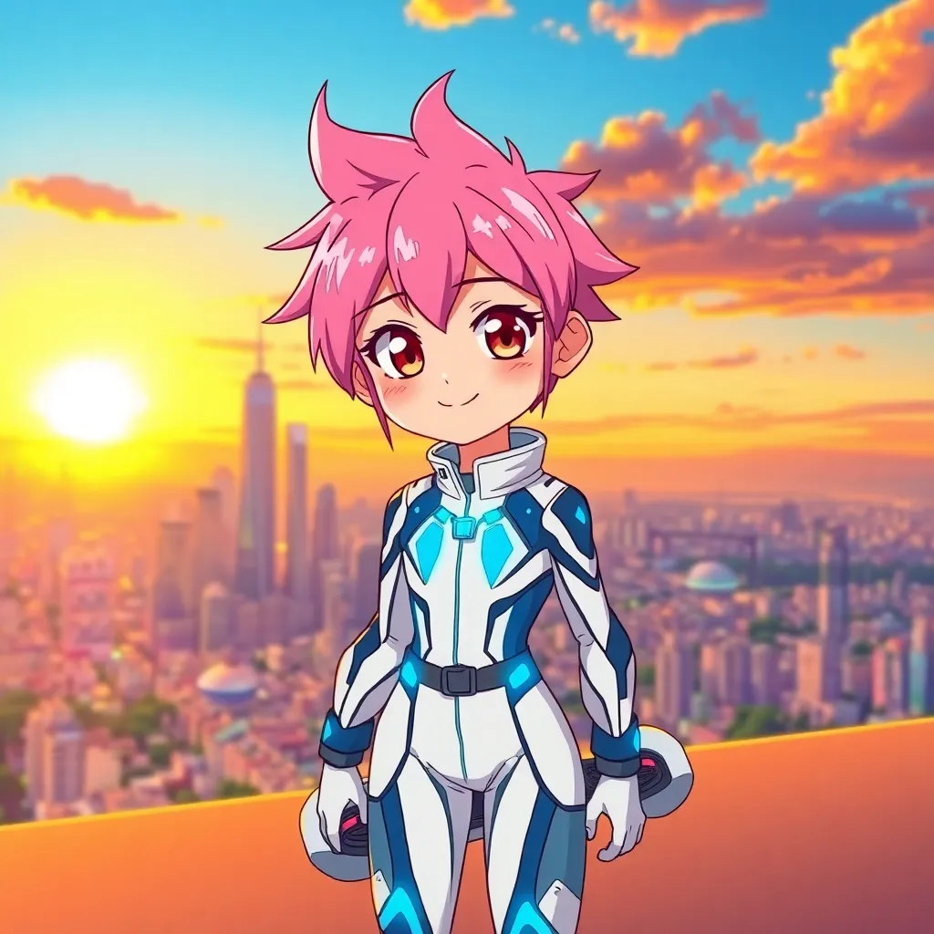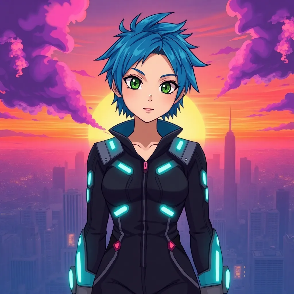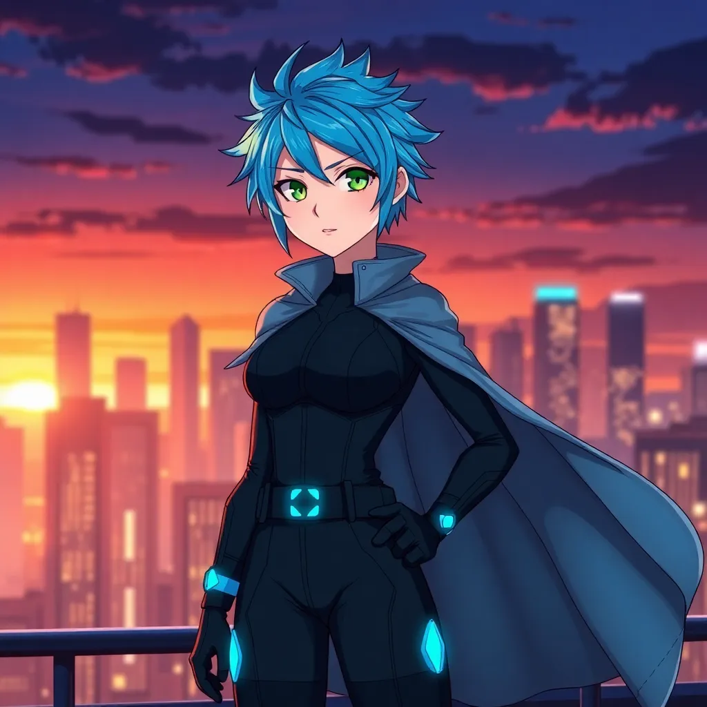 Create a futuristic anime character, 'Aurora', standing in front of a neon-lit cityscape at sunset. She has short, spiky blue hair and piercing green eyes. Her outfit is a sleek black jumpsuit with a flowing silver cape and a utility belt with glowing blue accents. Her pose is confident and powerful.