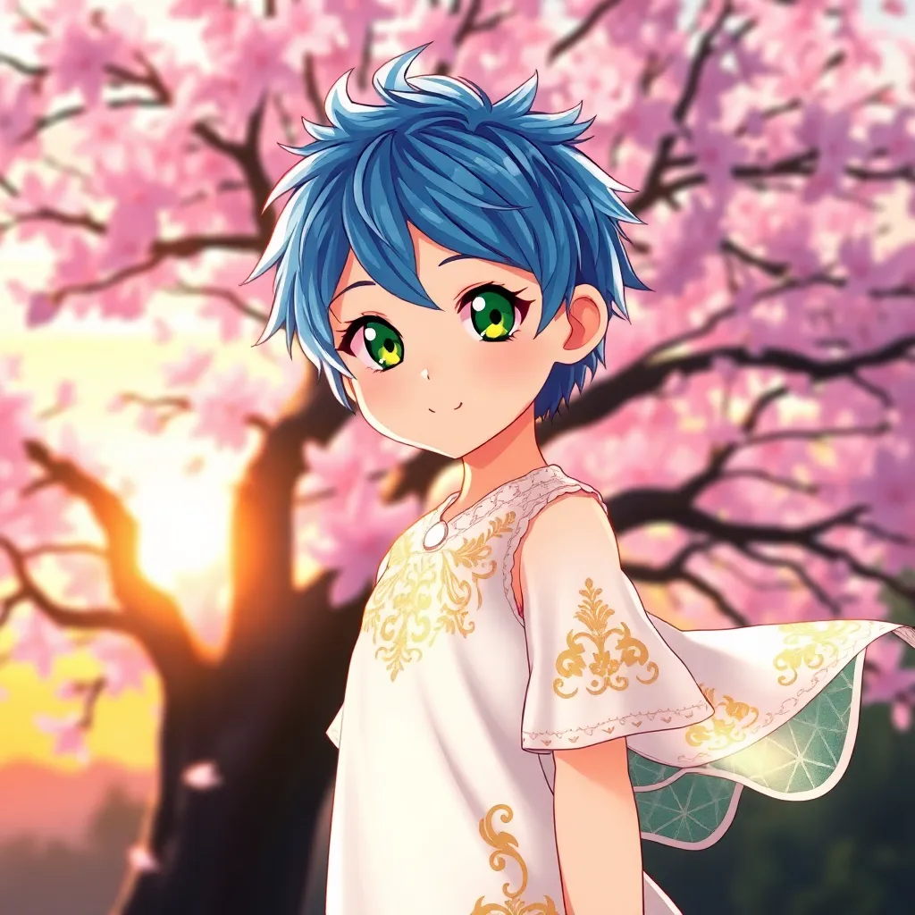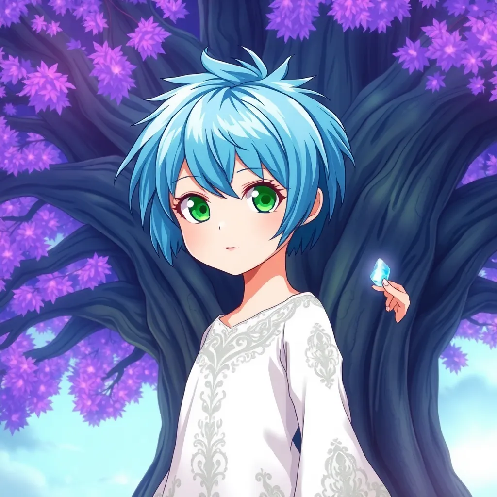 Create a vibrant anime illustration of a young girl with short, spiky blue hair and piercing green eyes, standing in front of a giant, ancient tree with glowing purple leaves. She's wearing a flowing white dress with intricate silver embroidery, and her right hand is holding a small, shimmering crystal.