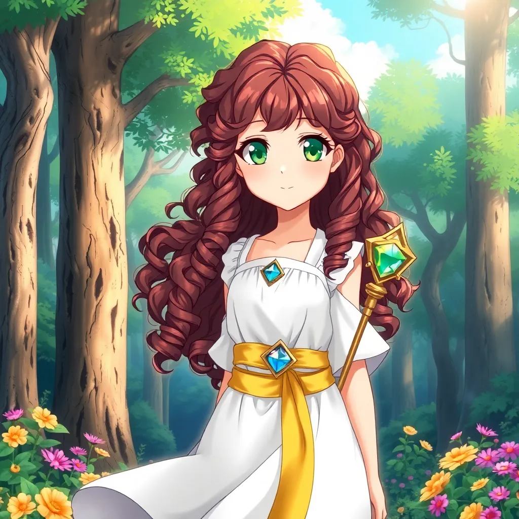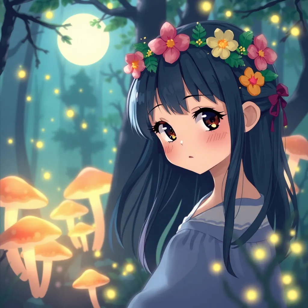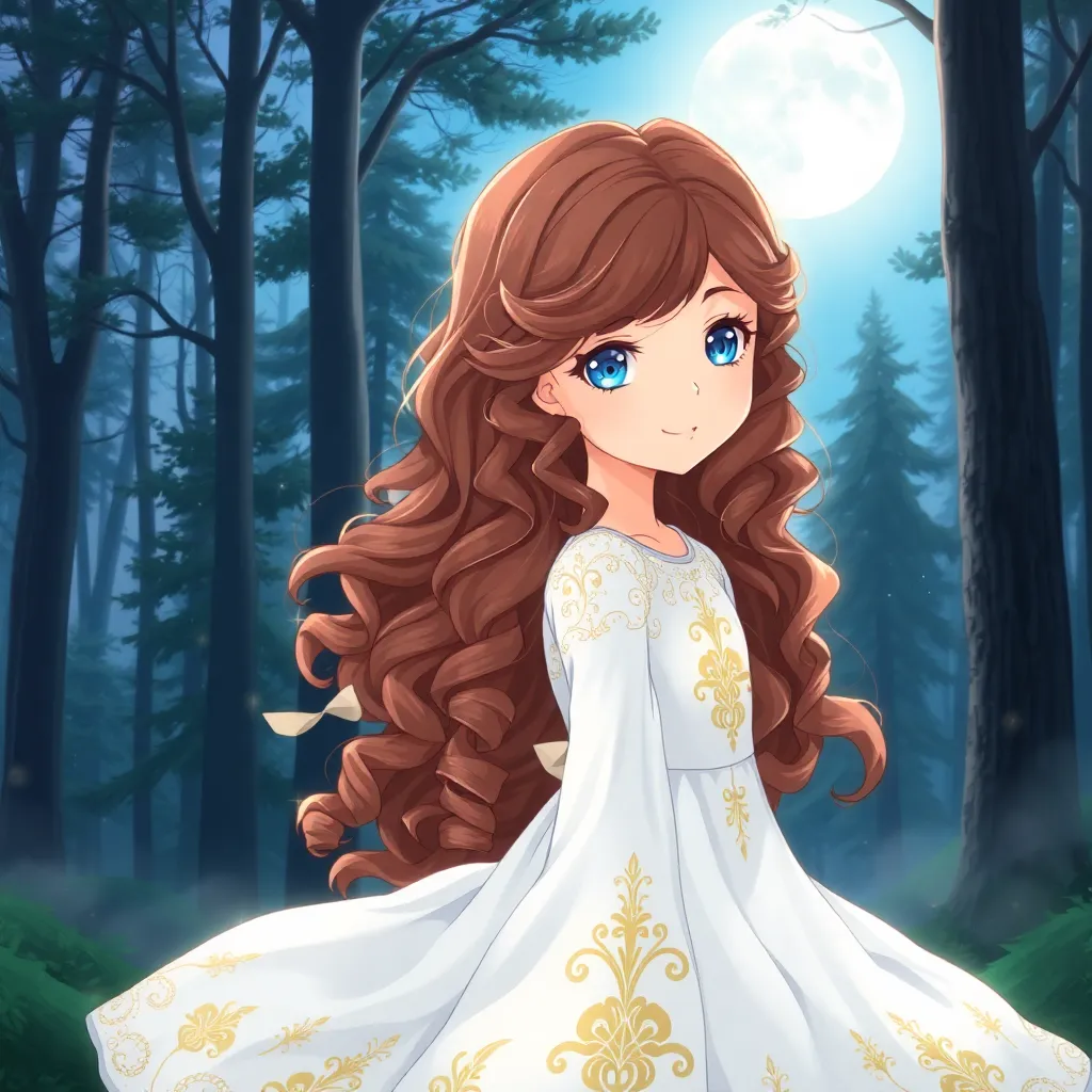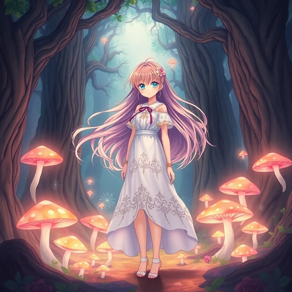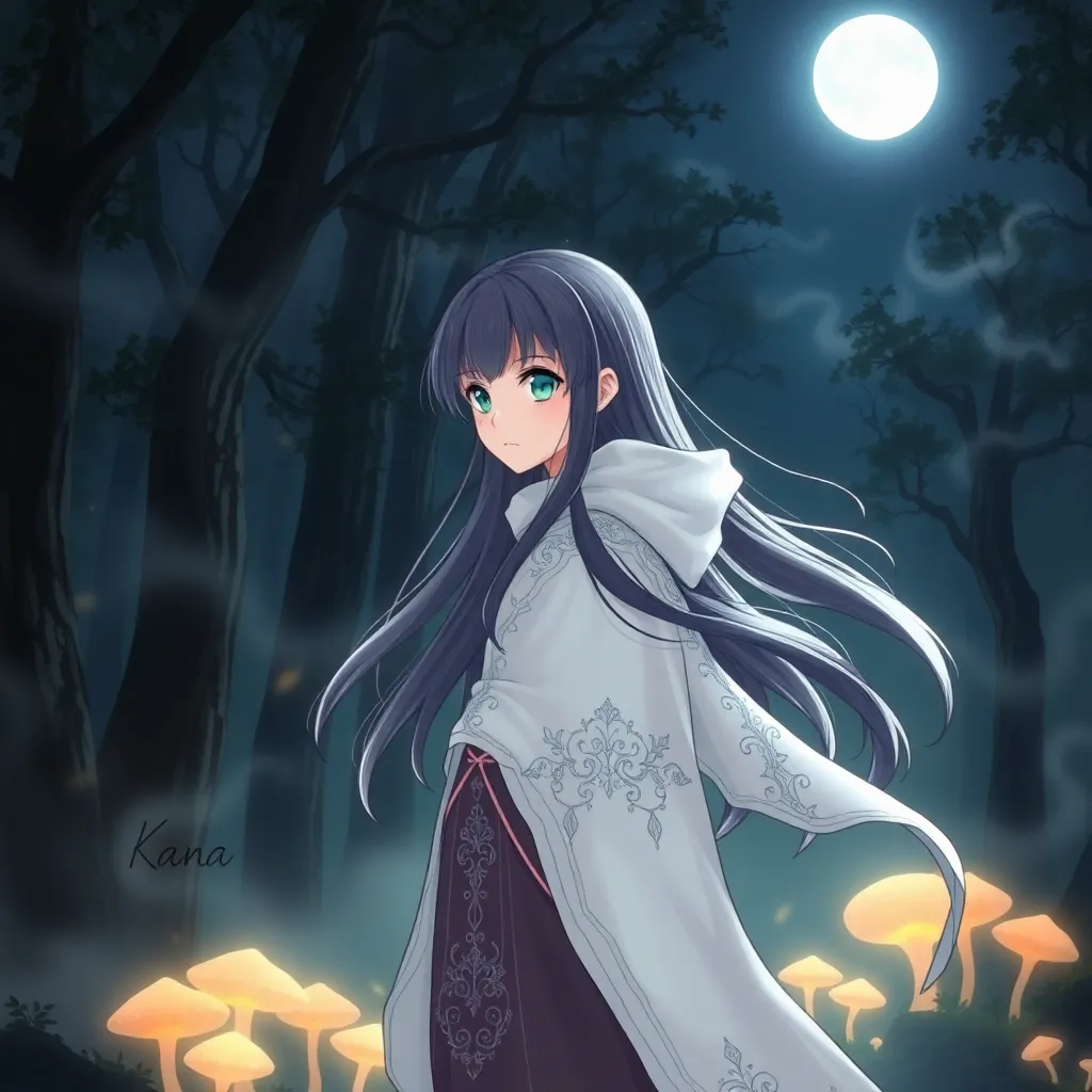 Create a stunning anime-style illustration of a young girl, Kana, standing in a mystical forest surrounded by ancient trees and glowing mushrooms. She wears a flowing white dress with intricate designs, and her long hair flows like the wind. Her eyes shimmer with a soft, ethereal light. Generate an image with vibrant colors and whimsical details.