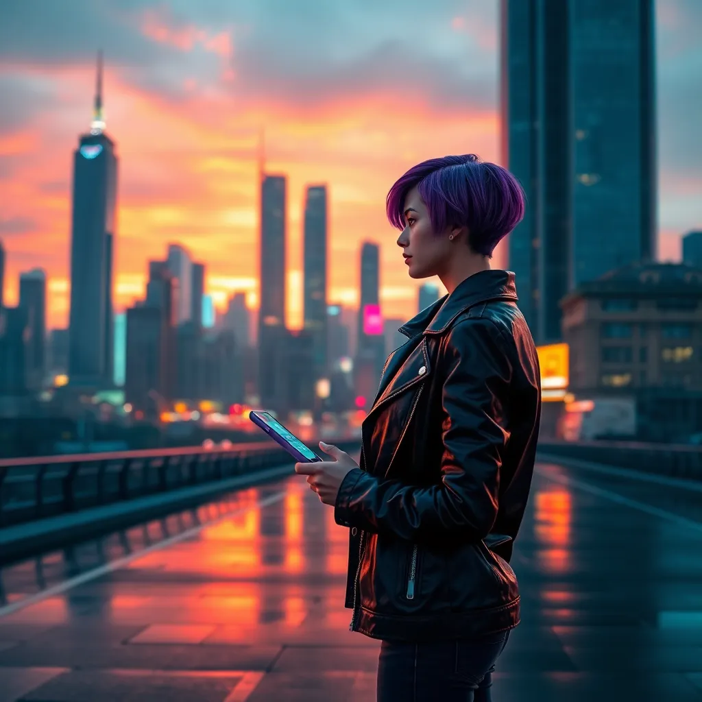 Create a futuristic cityscape at sunset, with towering skyscrapers and neon lights reflecting off the wet pavement. In the foreground, a young woman with short purple hair and a black leather jacket stands confidently, gazing out at the city with a hint of determination and a futuristic smartphone in hand.