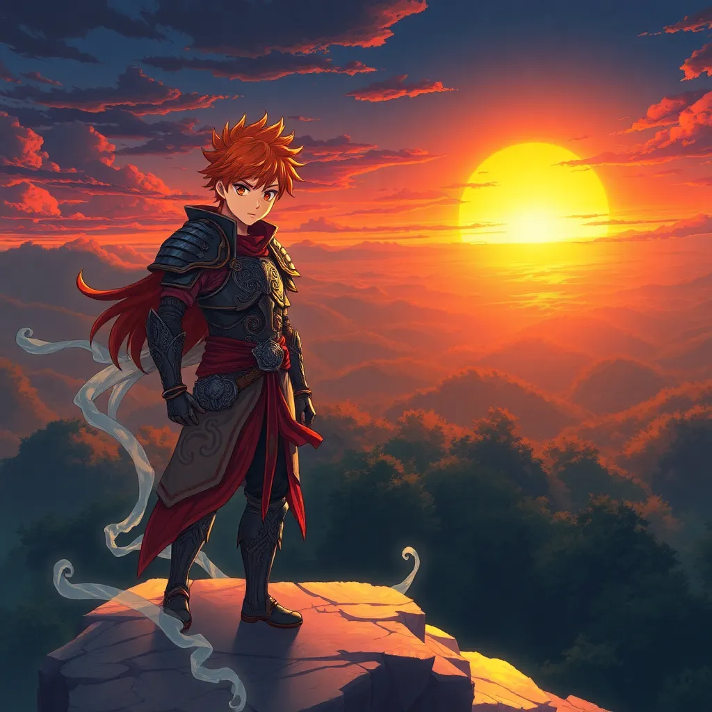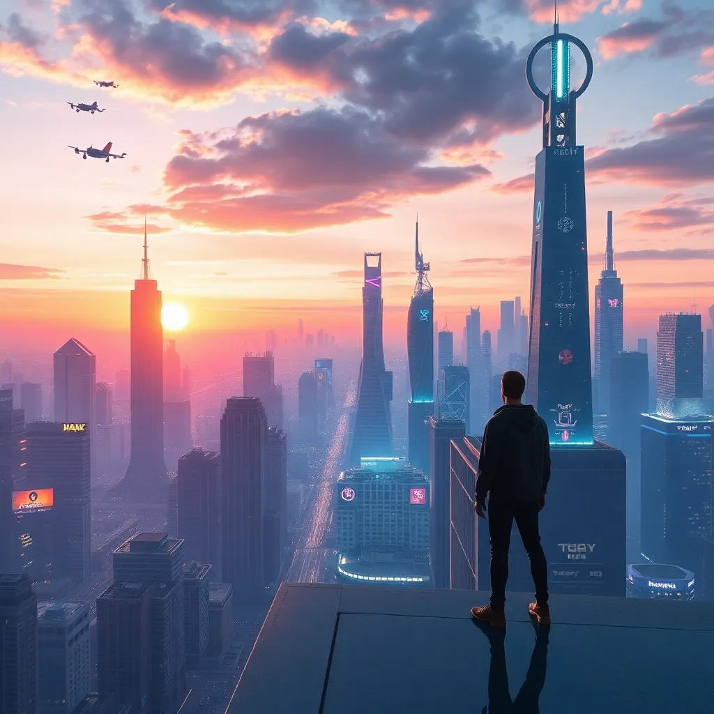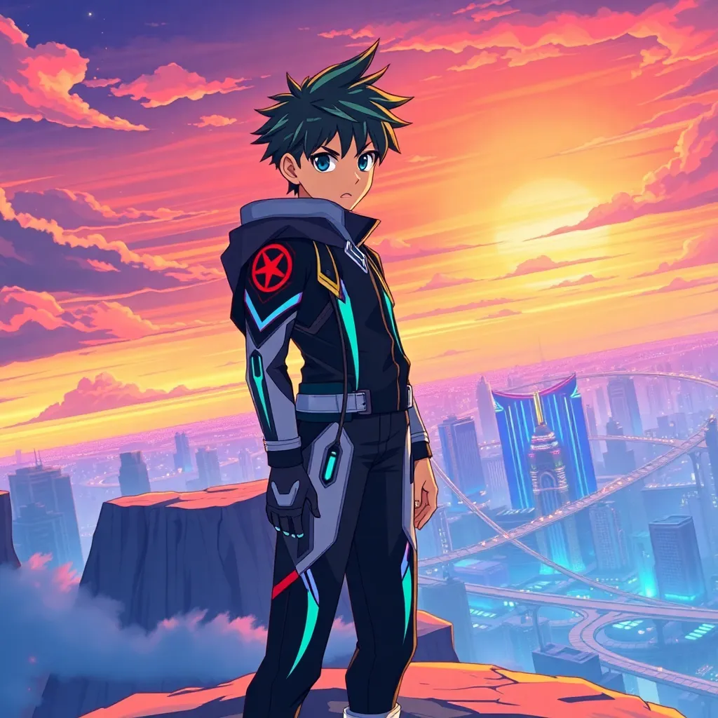 Create a vibrant anime image of a young, adventurous protagonist, Kaito, standing on a cliff overlooking a futuristic cityscape at sunset. Kaito is dressed in a sleek, high-tech outfit and has a determined expression on his face. Incorporate neon lights, clouds, and a hint of magic in the background.