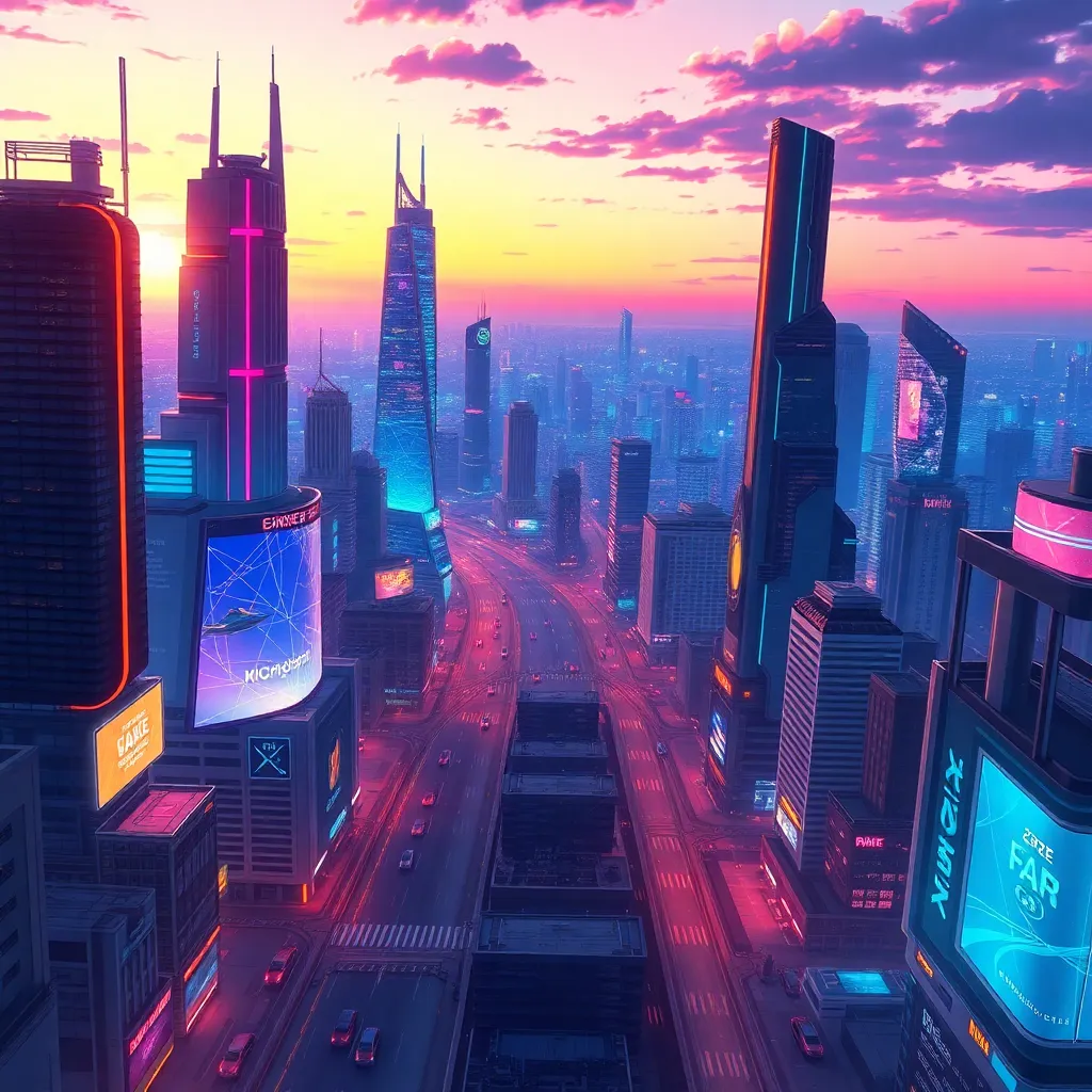 Create an anime-style illustration of a futuristic cityscape at sunset, with towering skyscrapers, flying cars, and holographic advertisements. The scene should be vibrant with neon lights, and the atmosphere should be electric with energy. Incorporate a sense of movement and dynamism, as if the city is alive and in motion.