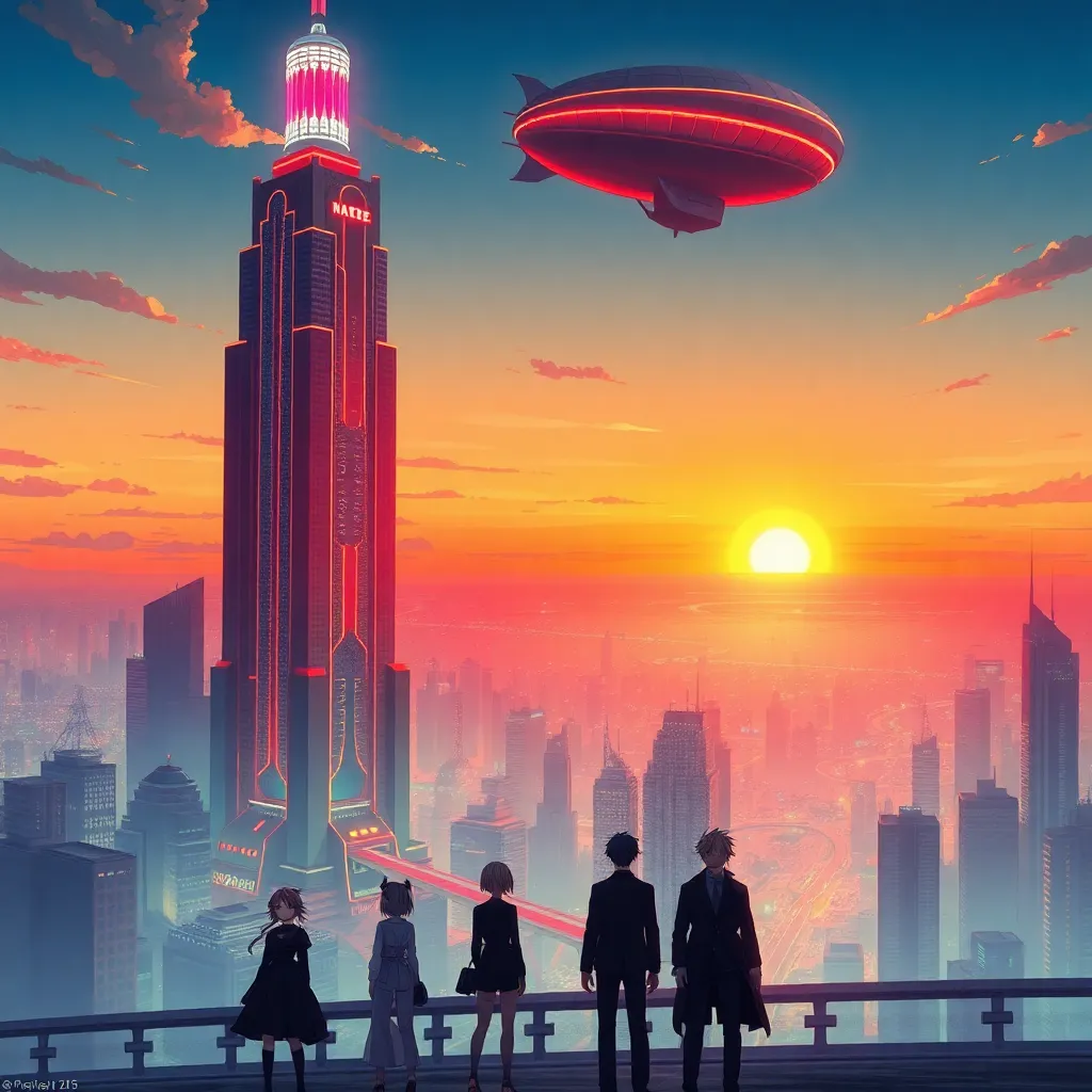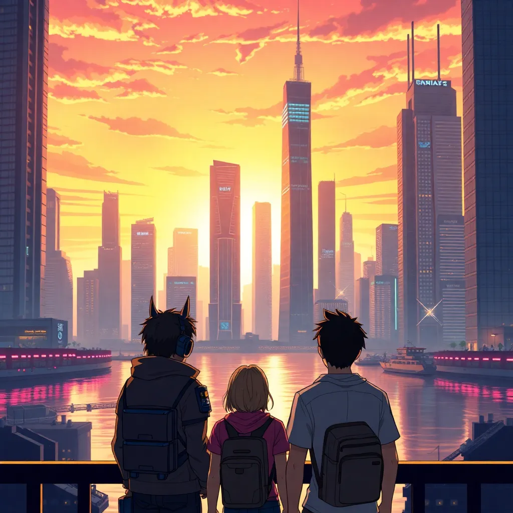 Create an anime-style image of a futuristic cityscape at sunset, with towering skyscrapers and neon lights reflecting off the water. In the foreground, a group of friends - a robotic engineer, a skilled hacker, and a charismatic leader - stand together, looking out at the city with a sense of hope and determination.