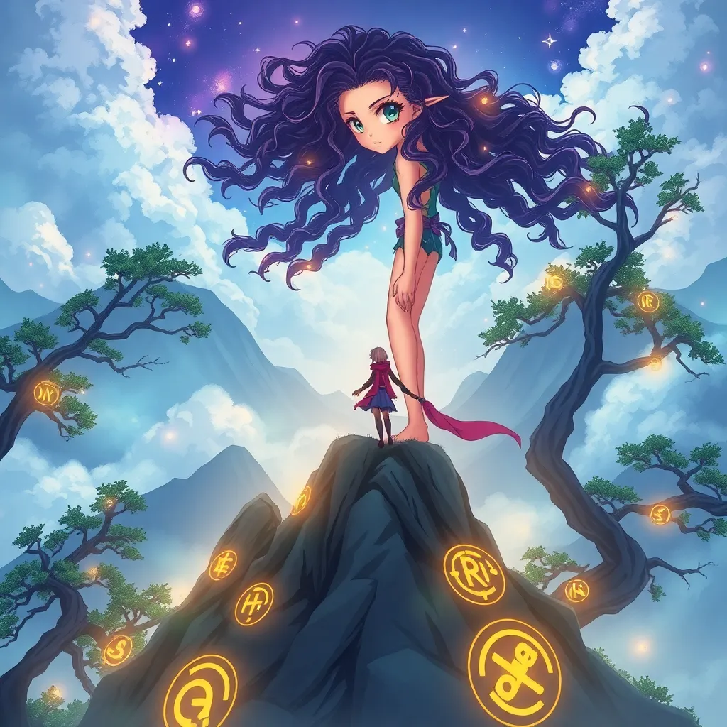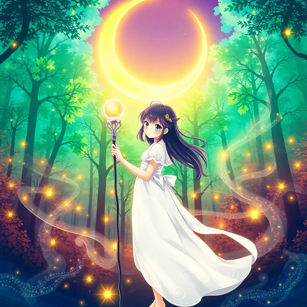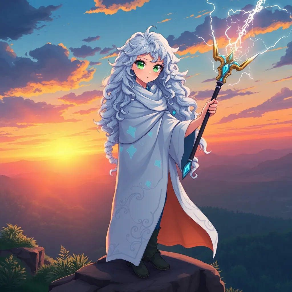 Create a vibrant anime-style illustration of a young, adventurous spirit named Luna, standing on a cliff overlooking a mystical forest at sunset. She has long, curly silver hair and piercing emerald eyes. She's wearing a flowing white cloak with intricate, glowing blue patterns and holding a staff that crackles with energy.