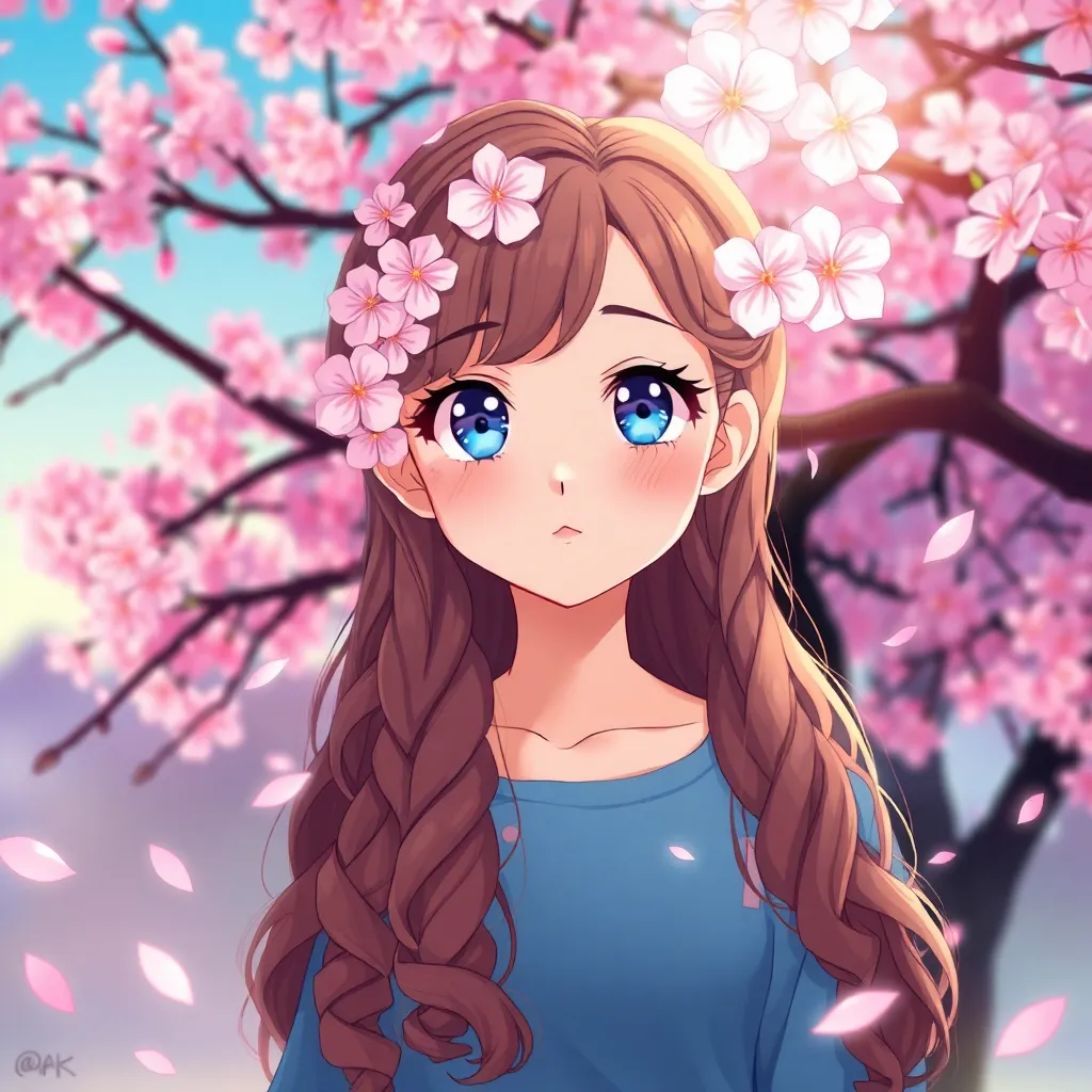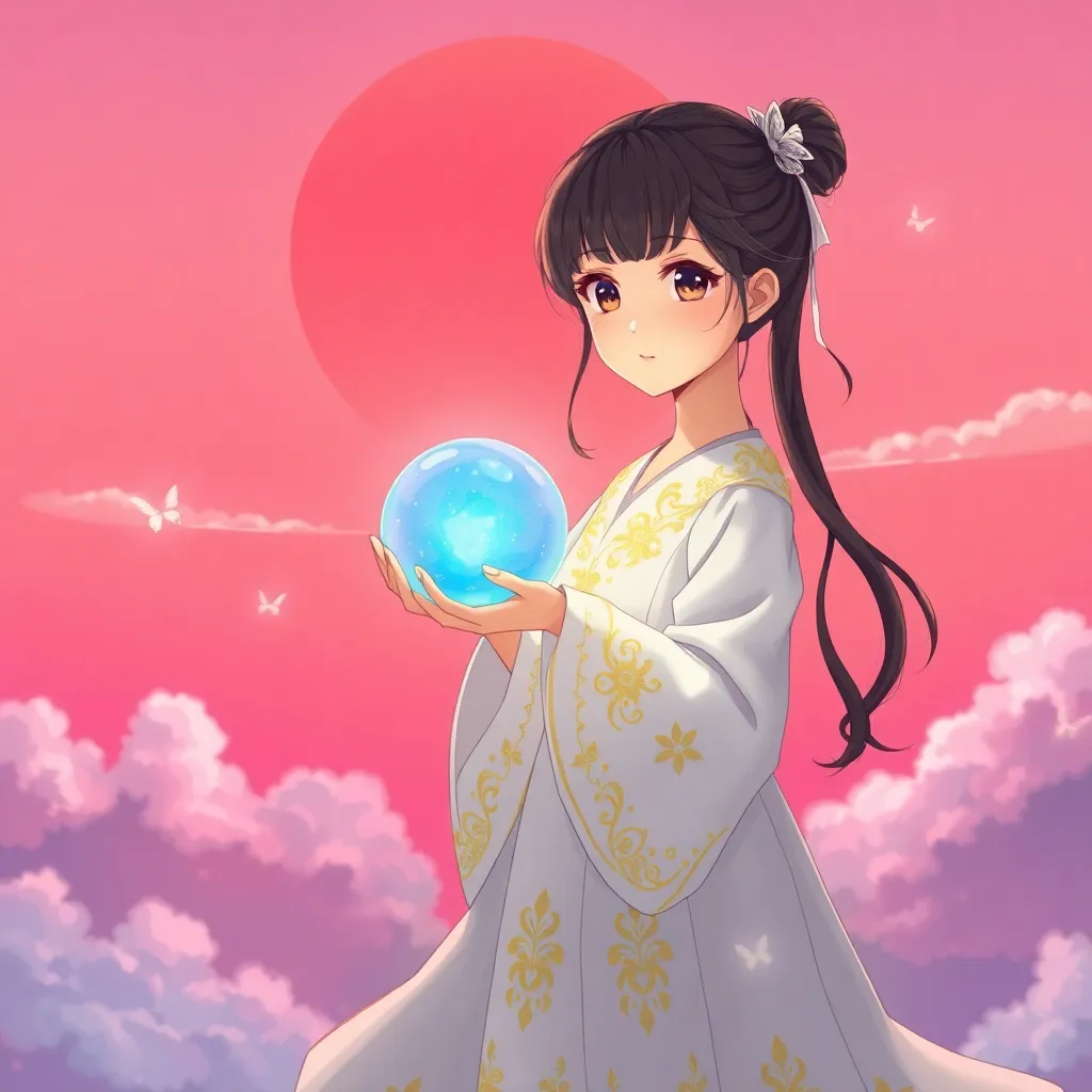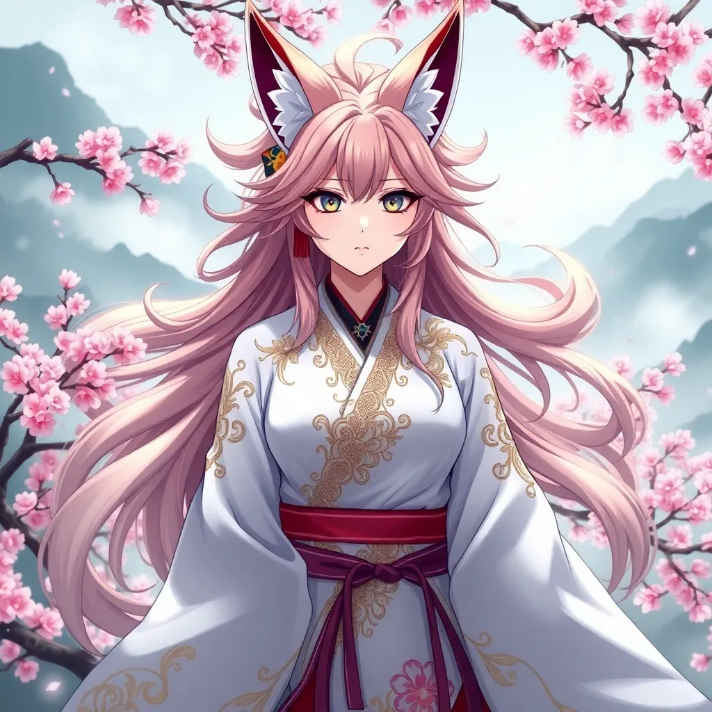Create a stunning anime character inspired by Japanese folklore, with a mystical fox spirit's nine tails as its hair, wearing a flowing white kimono with intricate golden embroidery, surrounded by cherry blossoms and misty mountains, with a serene and enigmatic expression, conveying a sense of ancient wisdom.
