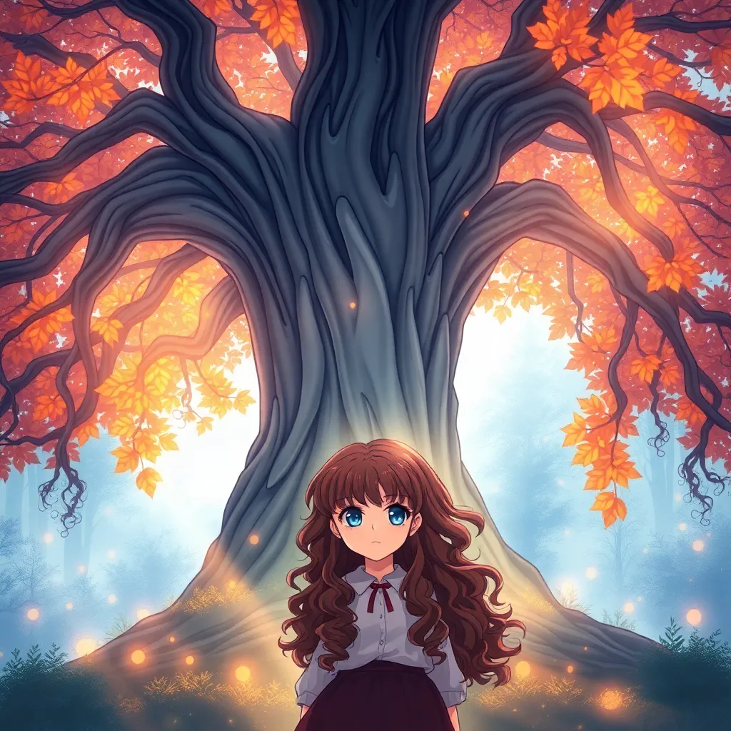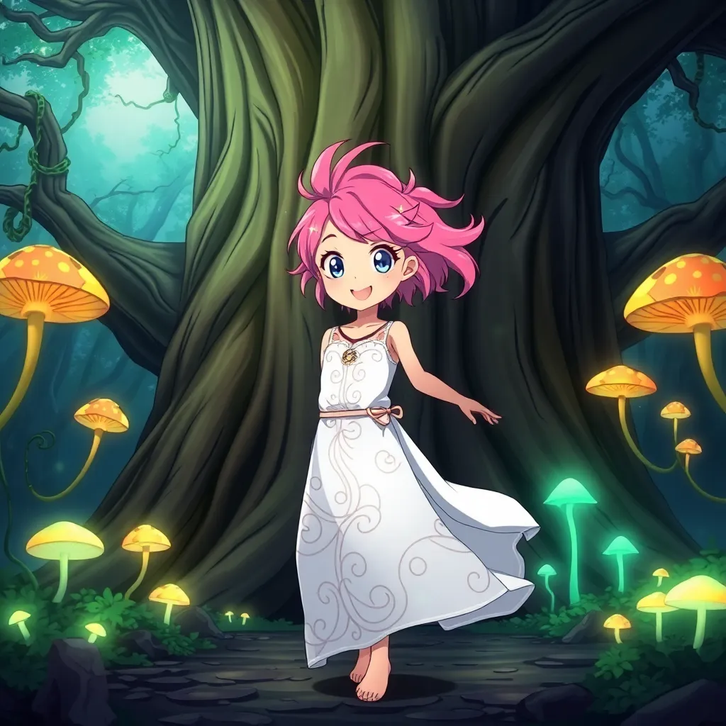 A young, energetic girl with bright pink hair and a sparkly smile is standing in front of a giant, ancient tree in a mystical forest, surrounded by glowing mushrooms and vines. She's wearing a flowing white dress with intricate, swirling patterns. Create an anime-style image that captures her adventurous spirit.