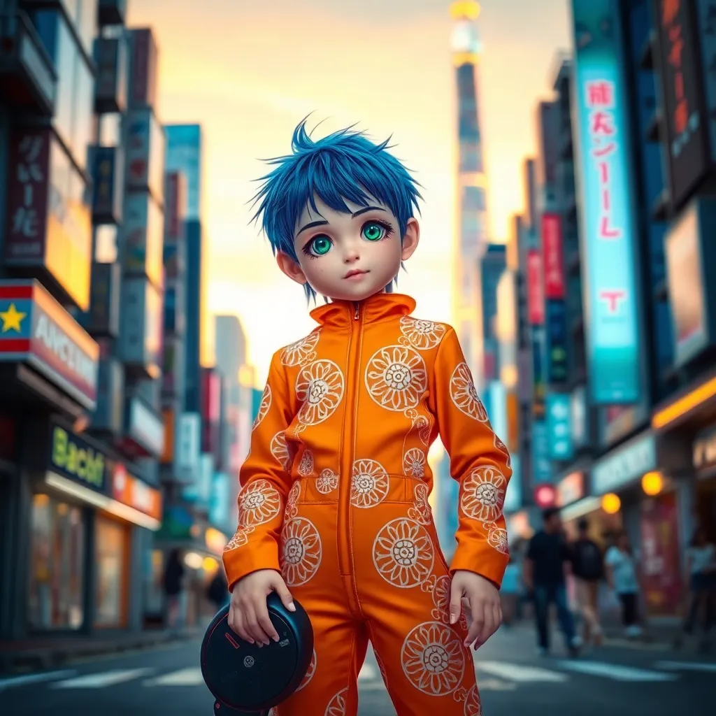 A young girl with short, spiky blue hair and piercing green eyes stands confidently in the midst of a bustling Tokyo street at sunset. She's dressed in a vibrant orange jumpsuit with intricate white patterns, holding a futuristic hoverboard and gazing up at a neon-lit skyscraper. Capture her dynamic pose and expressive face.
