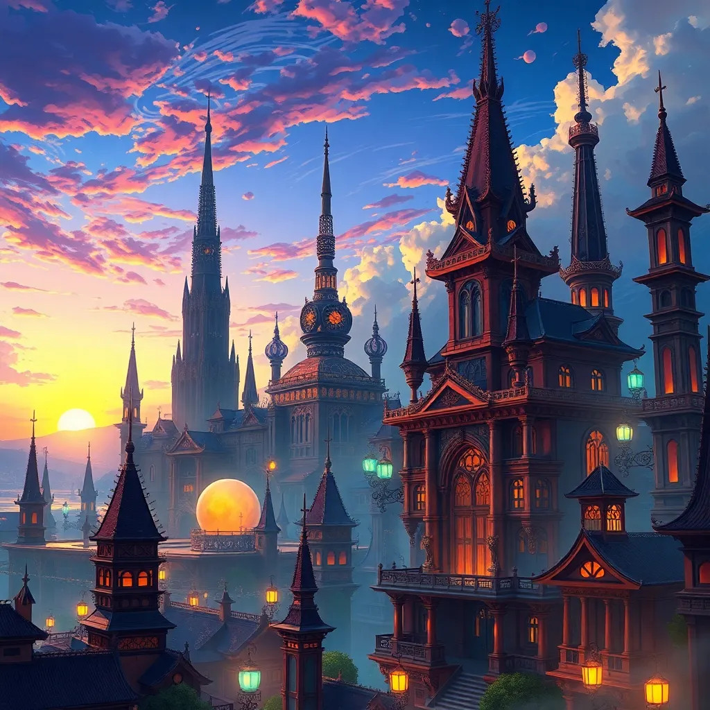 Create a fantastical cityscape at sunset, with towering spires and grand architecture inspired by Japanese and European styles. Incorporate mystical elements, such as glowing orbs and wispy clouds, and a hint of steampunk machinery. The scene should evoke a sense of wonder and magic, with vibrant colors and intricate details.