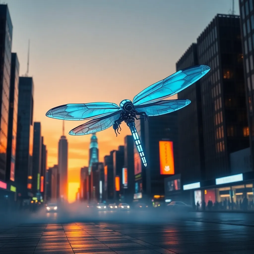 Create a futuristic cityscape at sunset, with a giant robotic dragonfly hovering above the skyscrapers, its iridescent wings glowing with a soft blue light. The city's neon lights reflect off the dragonfly's body, casting a mesmerizing glow on the pavement below. Incorporate a subtle mist effect to enhance the atmosphere.