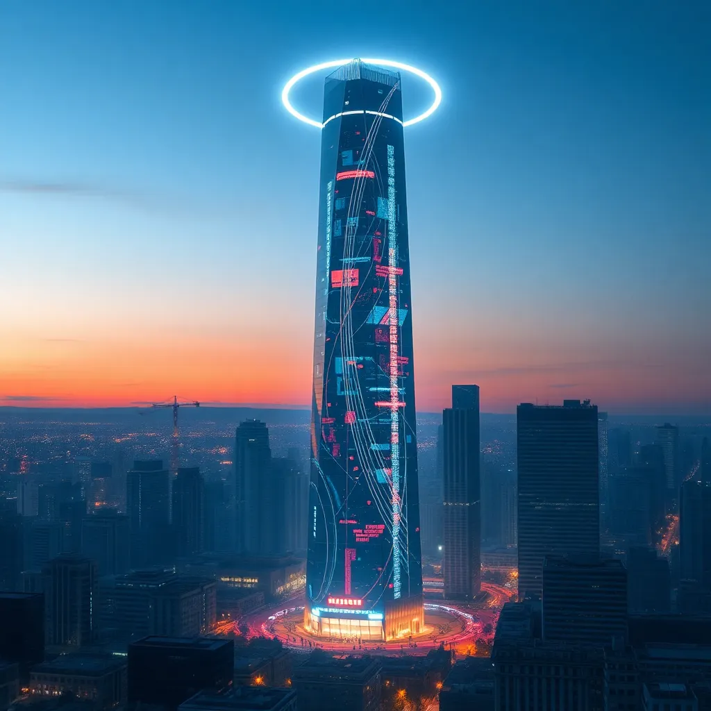 Create a futuristic cityscape at dusk, with a sleek skyscraper in the center, surrounded by a halo of light. The building's facade is a mesmerizing blend of neon lights and holographic projections, while the city's inhabitants go about their daily lives, unaware of the technological wonders above them.