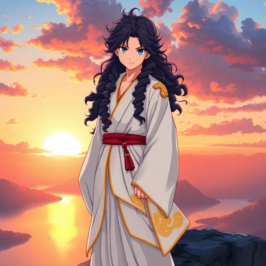 Create a stunning anime illustration of a young, spirited warrior named Akira, standing proudly on a cliff overlooking a serene lake at sunset. Akira wears a flowing white kimono with golden accents, and has long, curly black hair and piercing blue eyes. The atmosphere should be peaceful and majestic.