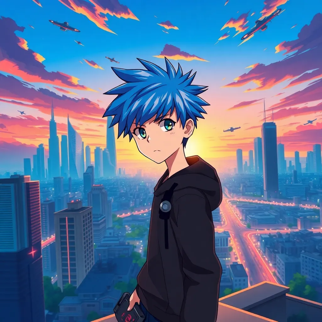 Create a vibrant anime-style illustration of a futuristic cityscape at sunset, with towering skyscrapers, flying cars, and a sprawling metropolis in the background. In the foreground, feature a young protagonist with short, spiky blue hair and a determined expression, standing on a rooftop with a futuristic device in hand.
