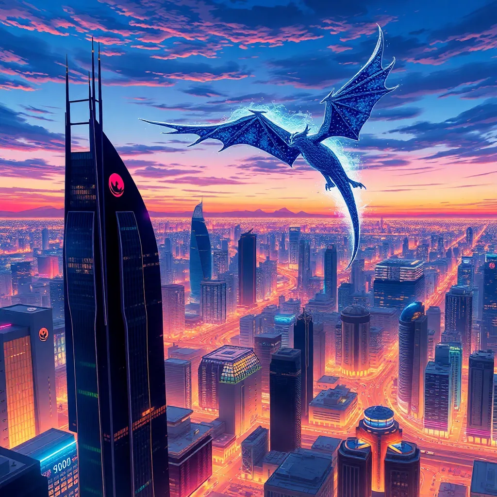 Create a stunning anime-style illustration of a futuristic cityscape at dusk, with sleek skyscrapers, neon lights, and a sprawling metropolis. Incorporate a majestic dragon soaring above the city, its scales glistening with a mesmerizing aura. The atmosphere should be vibrant, yet mystical, with a hint of ancient magic.
