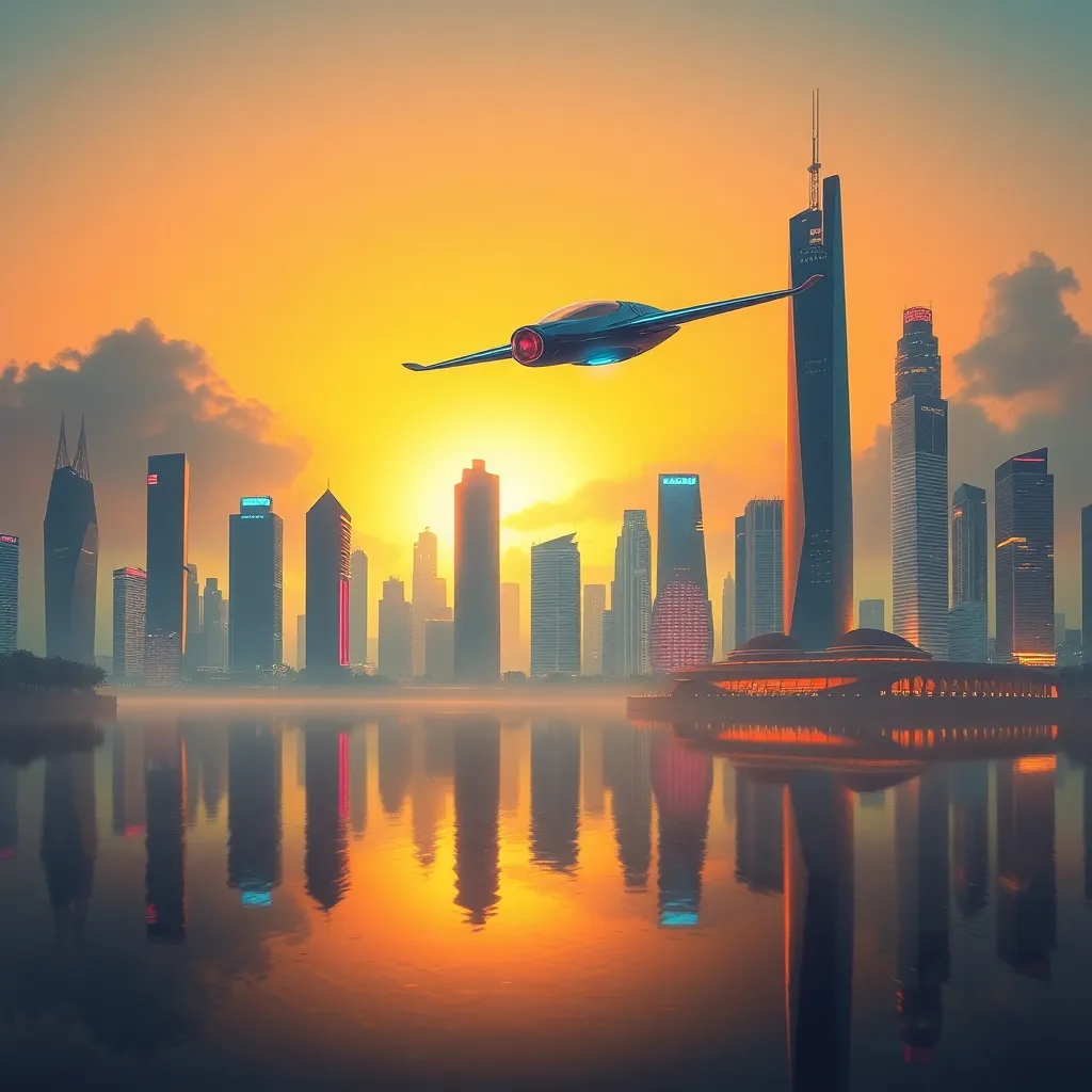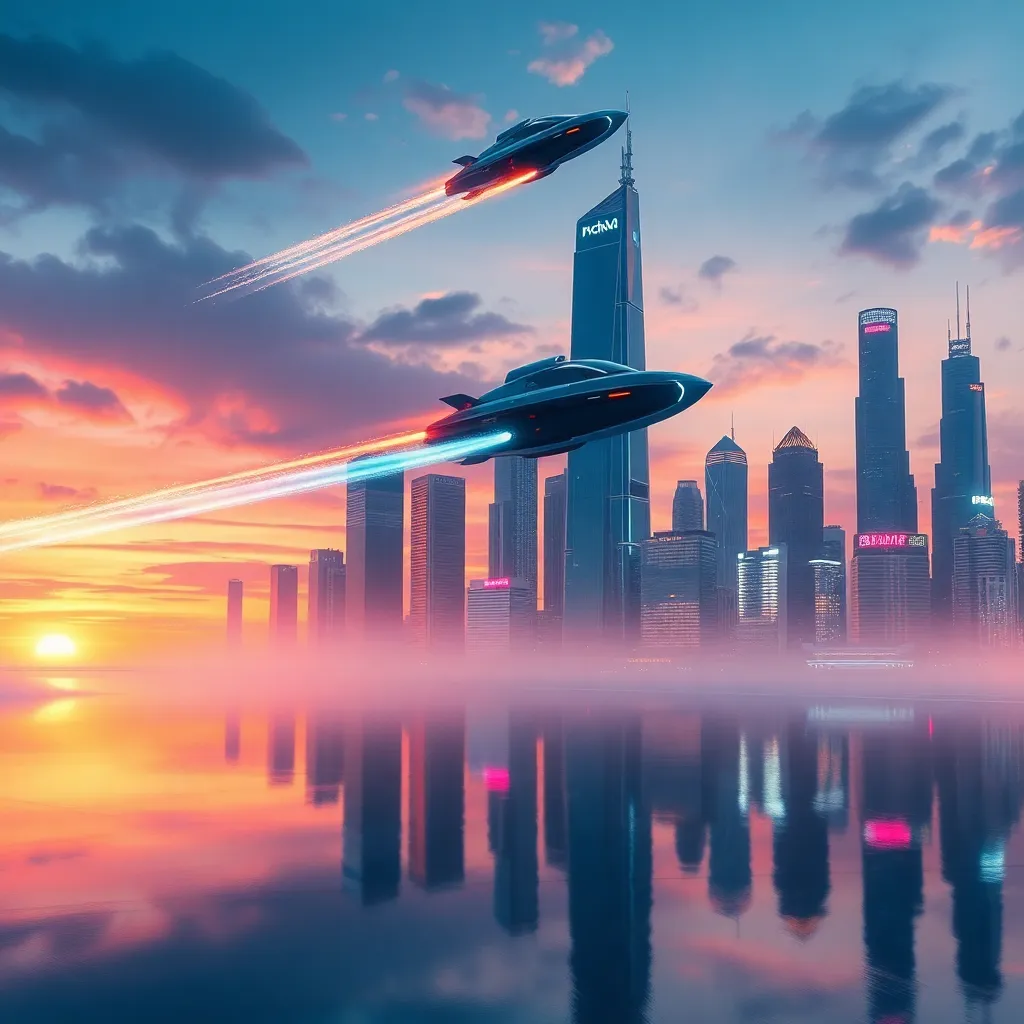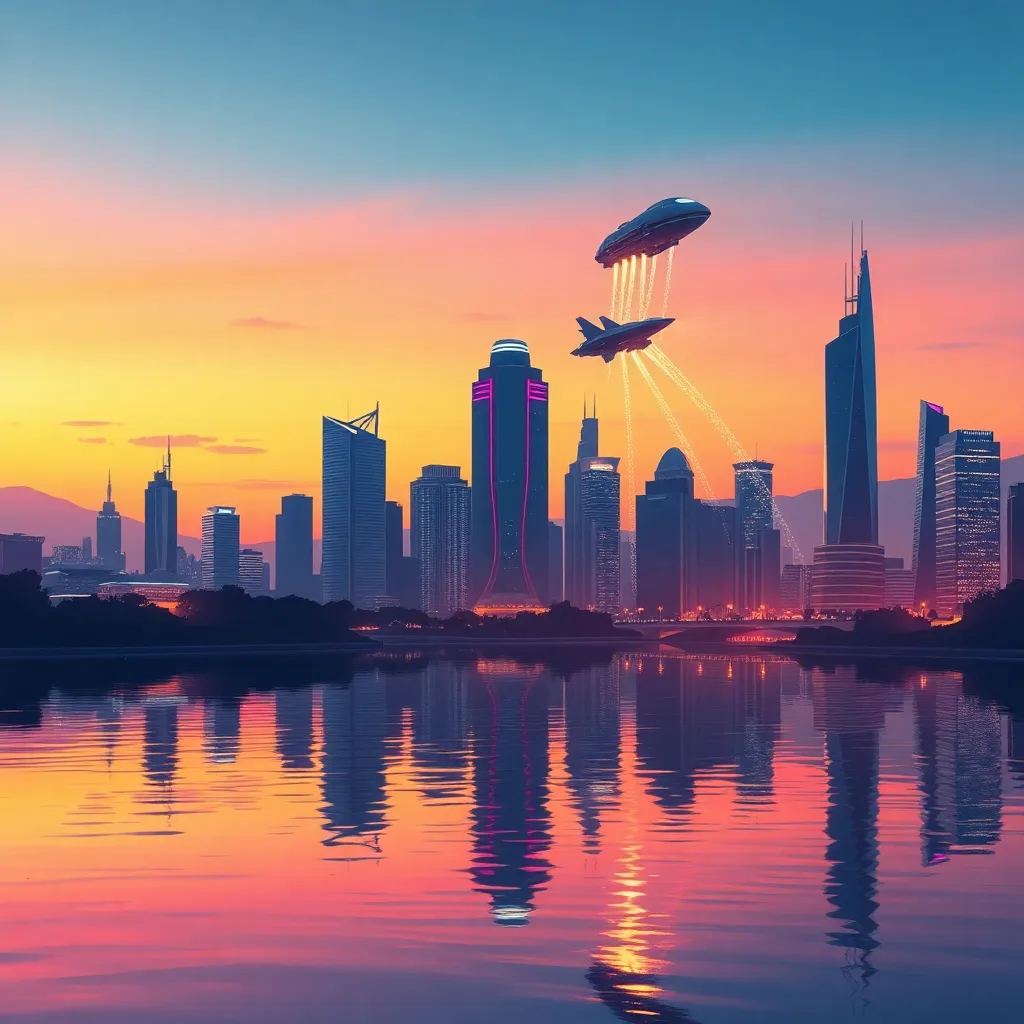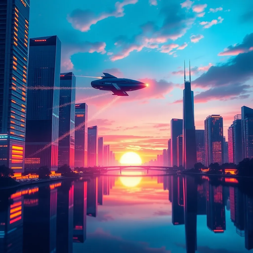 Create a futuristic cityscape at sunset, with sleek skyscrapers and neon lights reflecting off a serene lake. Incorporate a hovercraft flying above the city, leaving a trail of sparks. The atmosphere should be vibrant and energetic, with a sense of innovation and progress. Use a mix of blues, oranges, and purples.