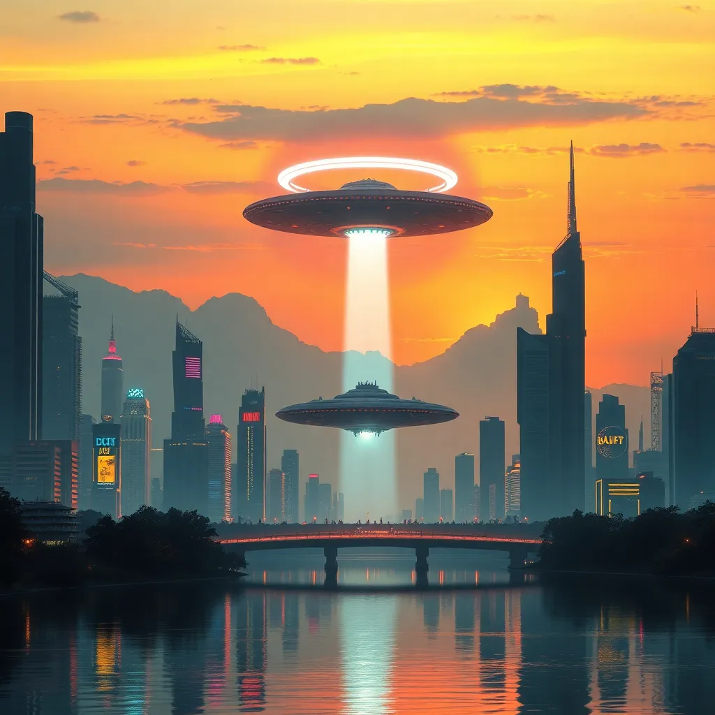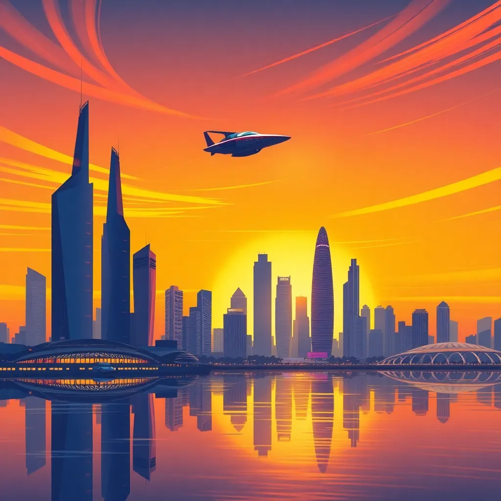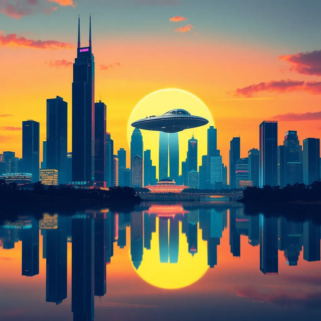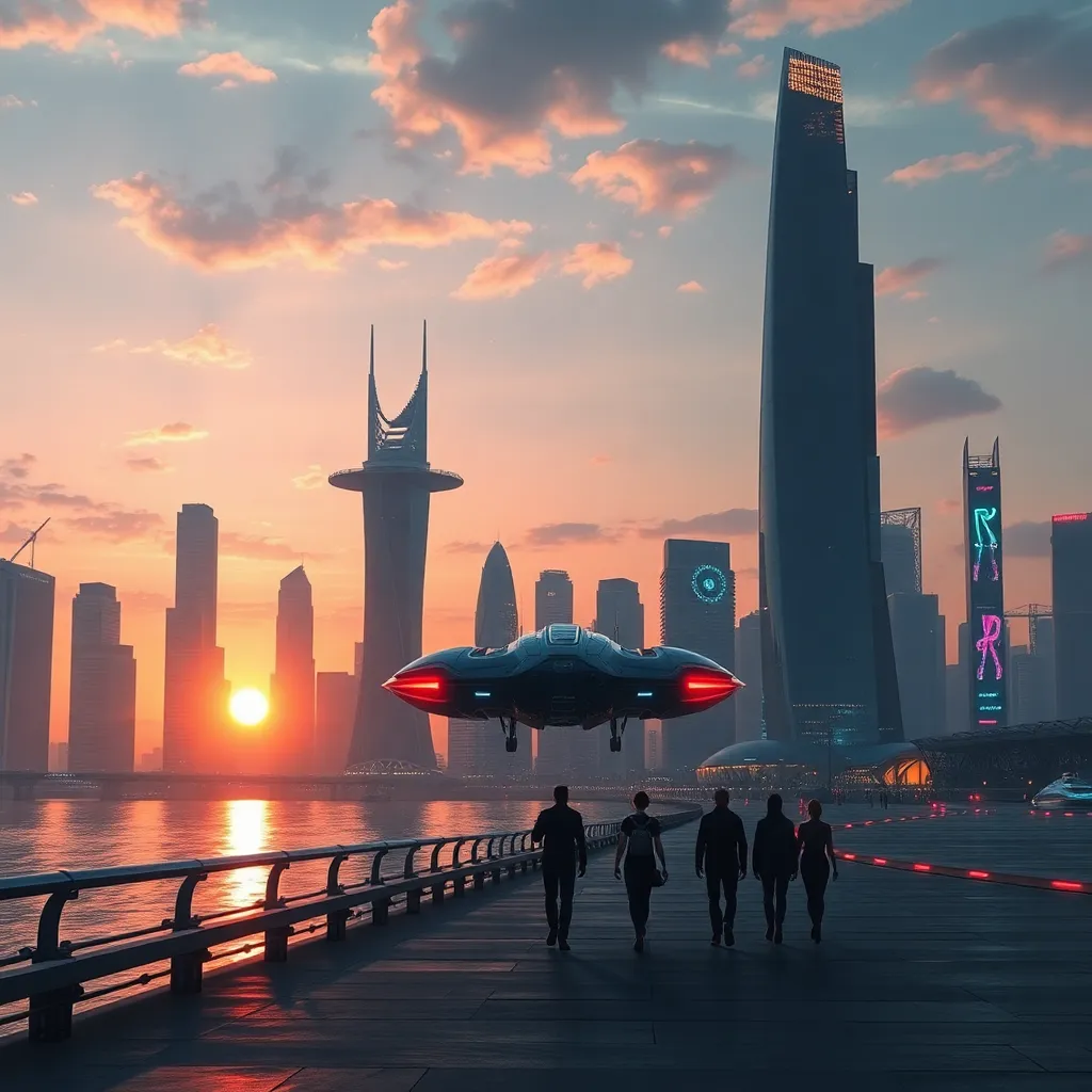 Create a futuristic cityscape at sunset, with sleek skyscrapers and neon lights reflecting off a serene lake. Incorporate a hovercraft flying above the city, leaving a trail of sparks. The atmosphere should be vibrant and energetic, with a sense of innovation and progress. Use a mix of blues, oranges, and purples.