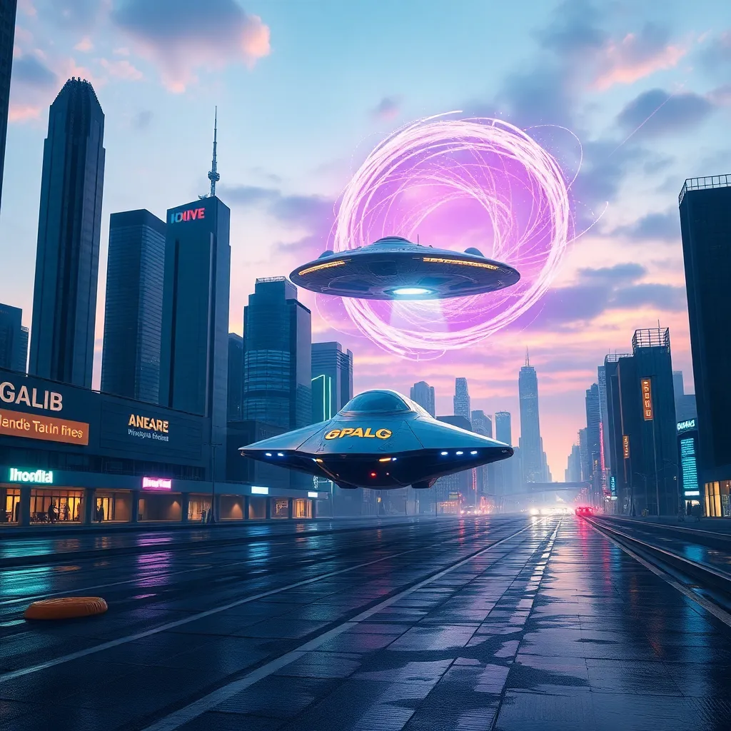 Create a futuristic cityscape at dusk with towering skyscrapers, neon lights, and a massive spaceship docked in the harbor. Incorporate a sense of movement and energy with swirling clouds, flying cars, and a bright blue-purple sky. Add a hint of mystery with a glowing, ancient temple in the distance.