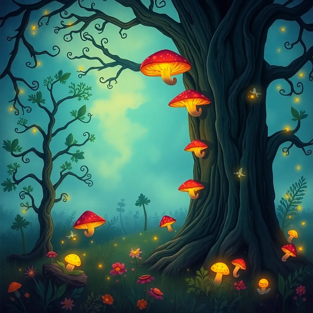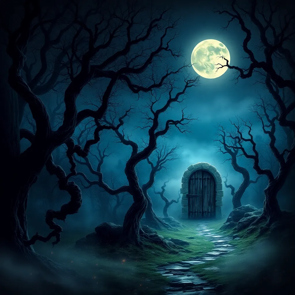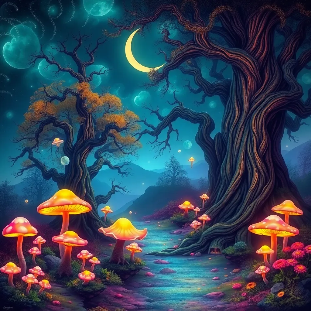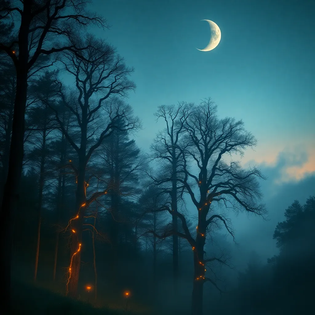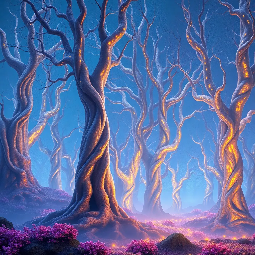 Create a surreal landscape featuring a glowing, iridescent forest with towering, twisted trees that seem to be made of a shimmering, ethereal material. Incorporate a subtle, shimmering mist that gives the scene an otherworldly ambiance. The color palette should be predominantly blues and purples, with hints of gold.