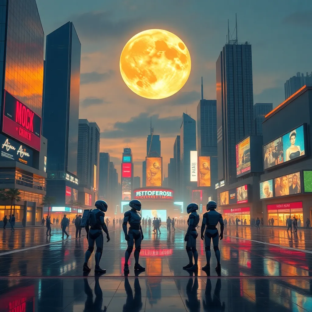 Imagine a futuristic cityscape at sunset, with sleek skyscrapers and neon lights reflecting off the wet pavement. A group of robots, dressed in stylish attire, are gathered at the city's central square, surrounded by holographic advertisements and a massive, glowing moon hovering above. Generate an AI image that captures this scene.