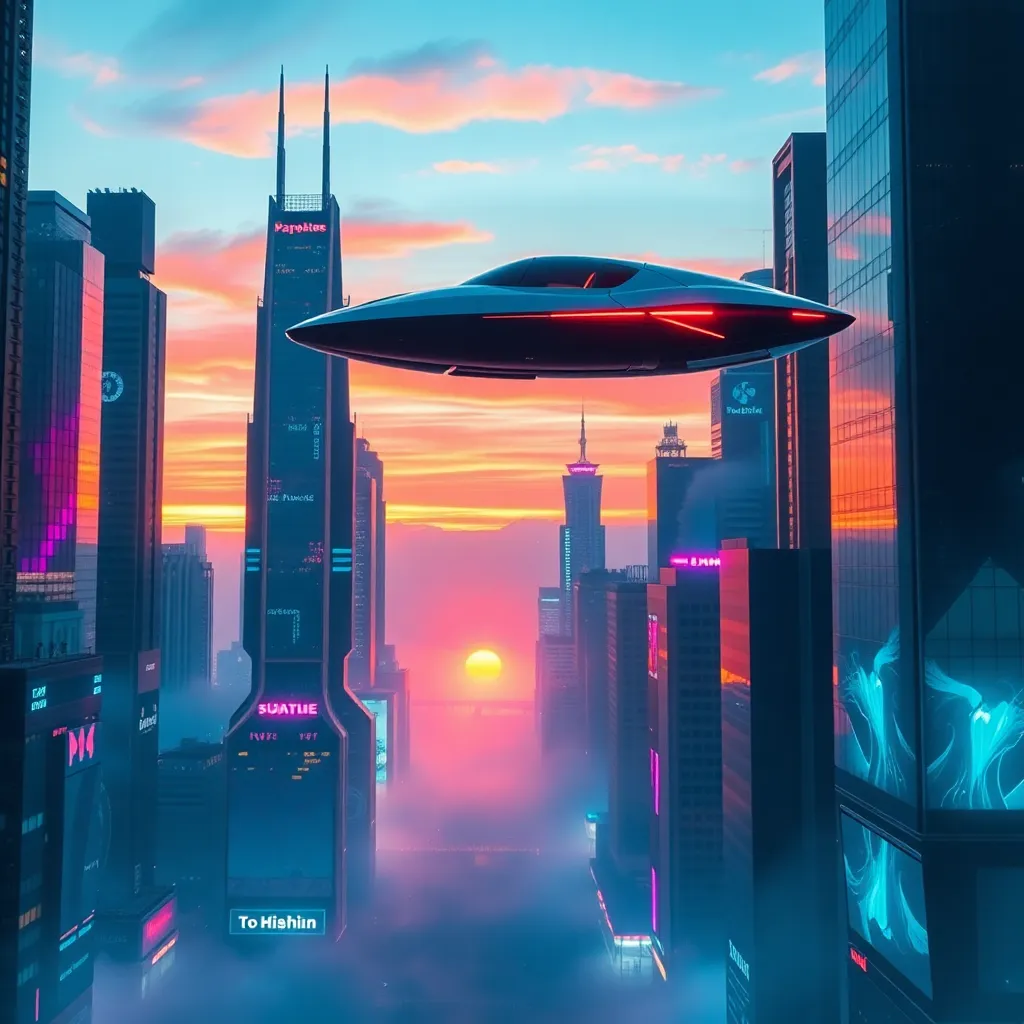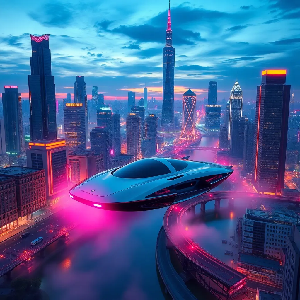 Create a futuristic cityscape at dusk, with towering skyscrapers, neon lights, and a sprawling metropolis. Incorporate a sleek, silver hovercar hovering above the streets, with a subtle mist rising from the city's canals. Blend vibrant colors with a dark, mysterious tone, evoking a sense of wonder and exploration.