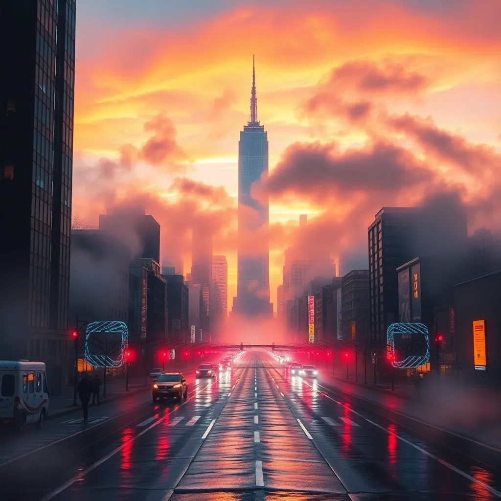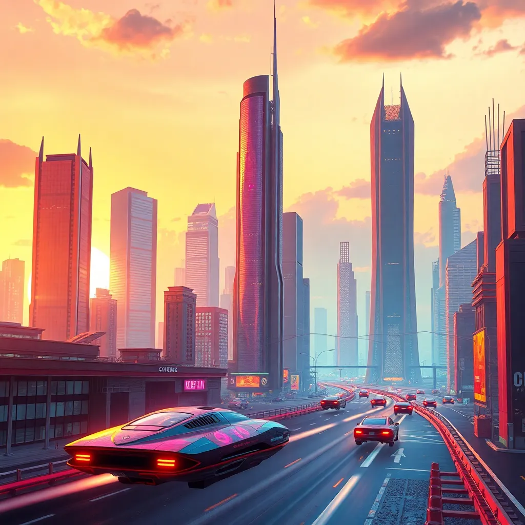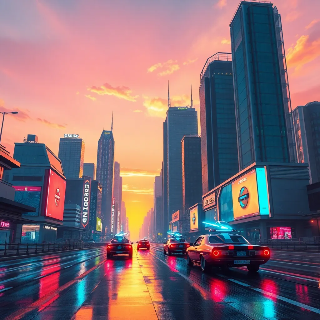 Create a futuristic cityscape at sunset, with towering skyscrapers and neon lights reflecting off the wet pavement. Incorporate a sense of movement with flying cars and hoverbikes zipping by. The sky should be a warm orange and pink hue, with a few wispy clouds scattered about. Make it vibrant and dynamic!
