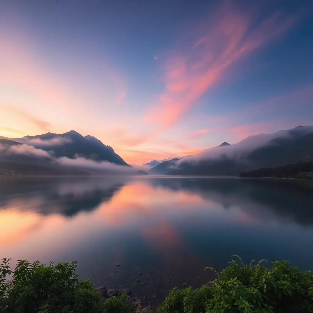 Create a futuristic cityscape at sunset, with sleek skyscrapers and neon lights reflecting off a serene lake. Incorporate a futuristic flying vehicle soaring above the city, with a hint of mist and fog in the background. Use vibrant colors and bold lines to capture the essence of innovation and progress.