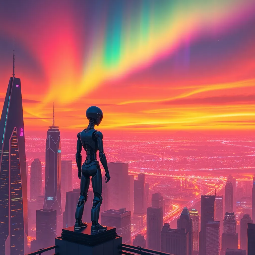 Create a futuristic cityscape at sunset, with sleek skyscrapers, neon lights, and a distant rainbow-colored aurora borealis. Incorporate a stylized, metallic robot standing on the rooftop of the tallest building, gazing out at the breathtaking view. The atmosphere should be vibrant, yet melancholic, with a hint of nostalgia.