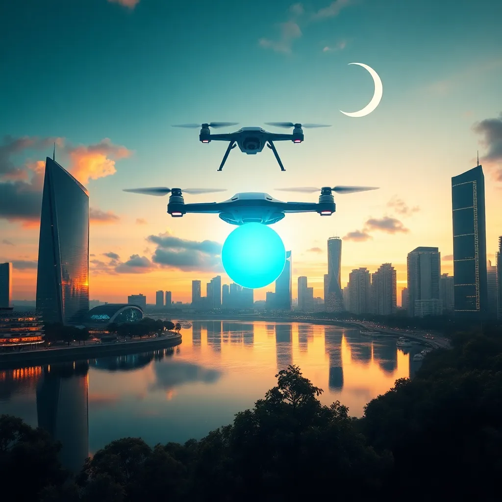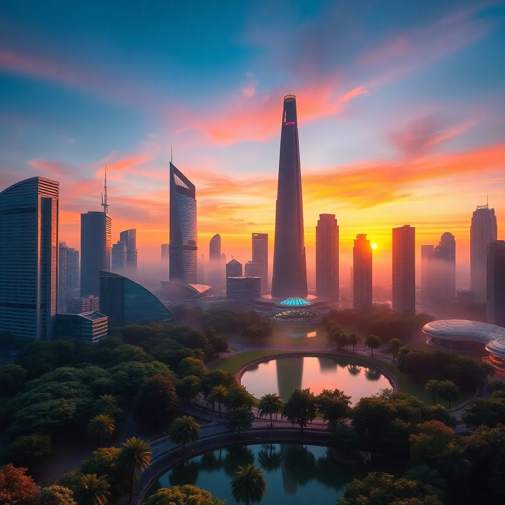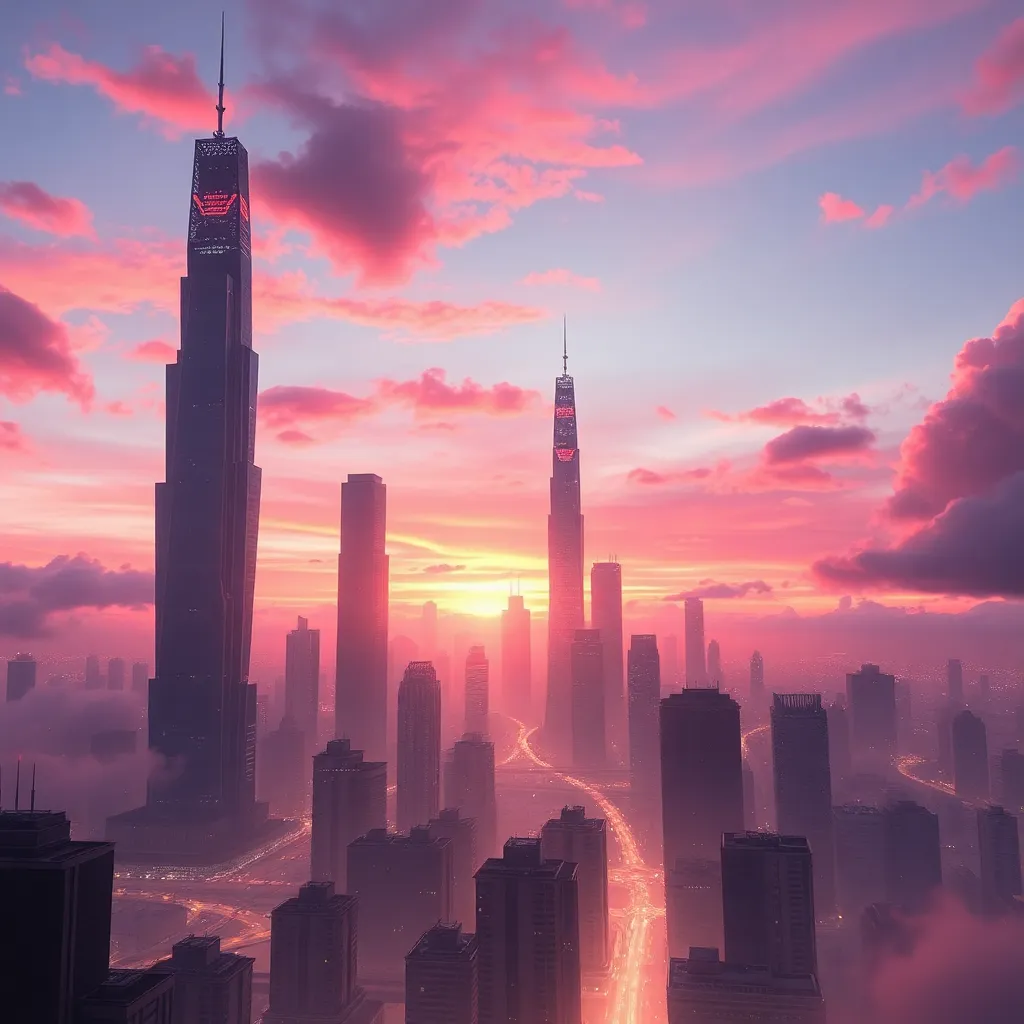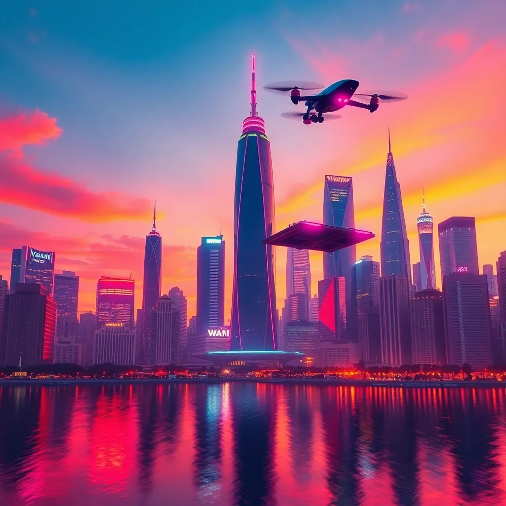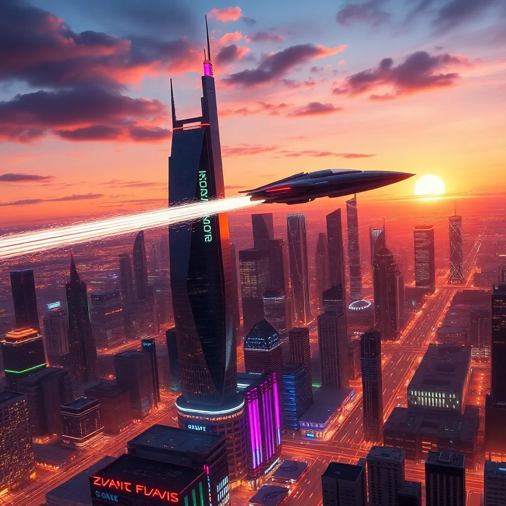 Generate a futuristic cityscape at sunset with a majestic skyscraper in the center, surrounded by hovering drones and sleek flying cars. Incorporate vibrant neon lights, a sprawling metropolis, and a sense of movement and energy. Blend realistic and stylized elements for a captivating and futuristic atmosphere.