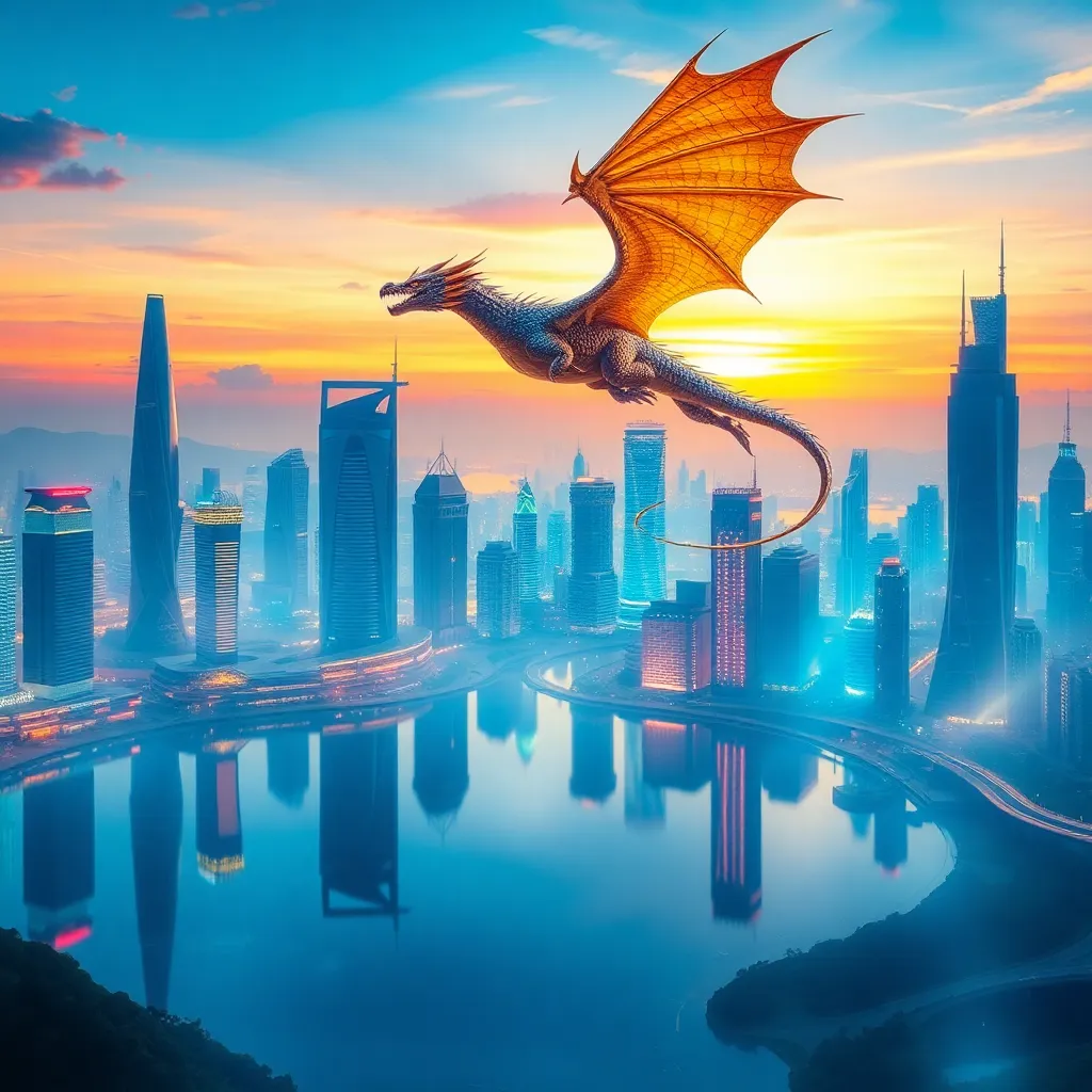 Create a futuristic cityscape at sunset, with sleek skyscrapers and neon lights reflecting off a serene lake. Incorporate a majestic flying dragon soaring above the city, its scales shimmering in hues of gold and blue. The atmosphere should be vibrant and dreamlike, with a sense of wonder and magic.