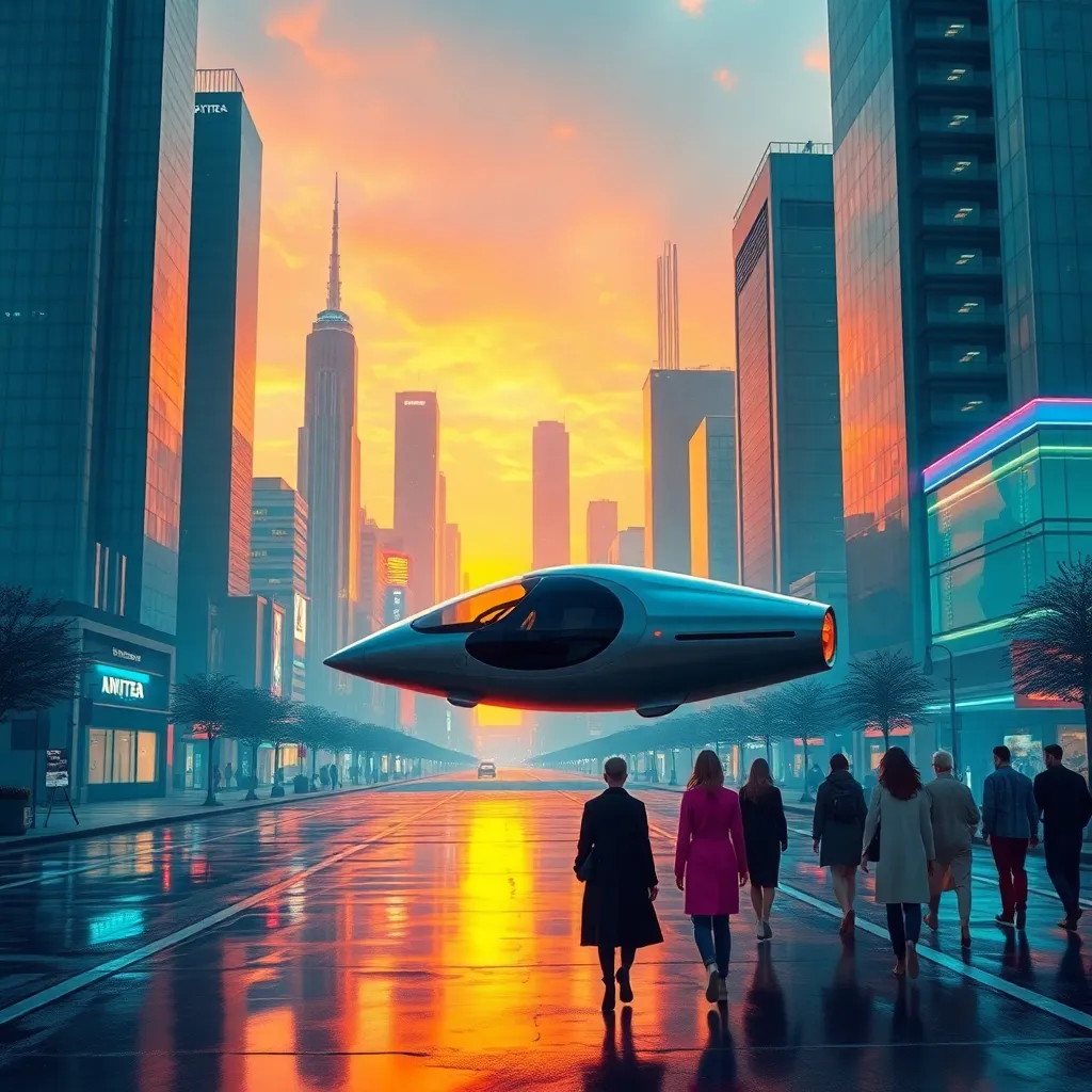 Create a futuristic cityscape at sunset, with towering skyscrapers and neon lights reflecting off the wet pavement. Incorporate a sleek, silver hovercar hovering above the street, and a group of people in stylish outfits walking towards the city's central square. Use a vibrant color palette with a mix of cool and warm tones.
