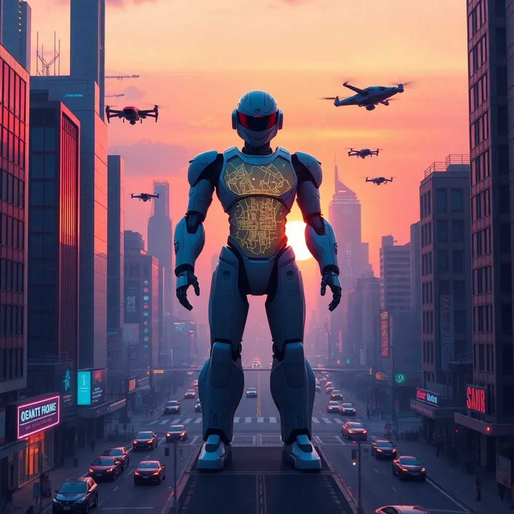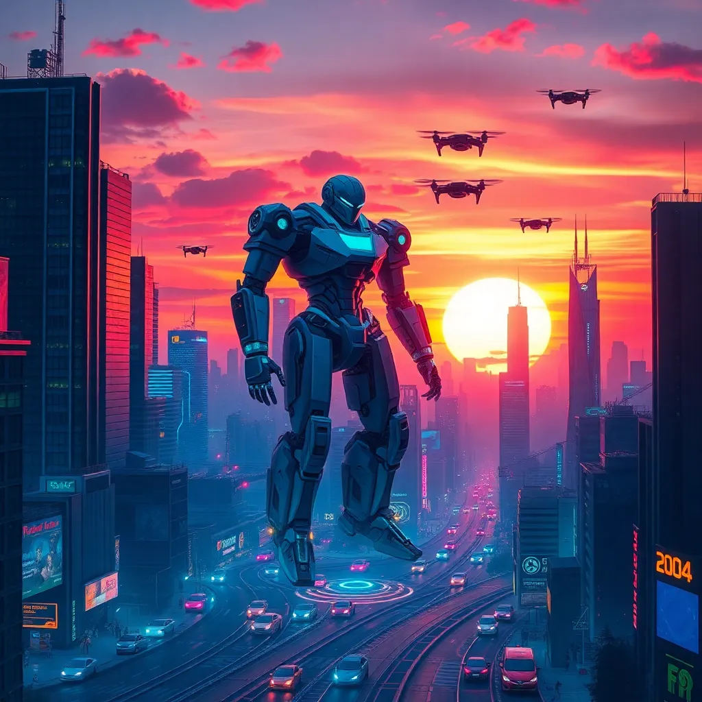 Create a futuristic cityscape at sunset. Incorporate sleek skyscrapers, neon lights, and a vibrant atmosphere. A giant robot stands tall in the center, surrounded by hovering drones and a swarm of flying cars. The sky is ablaze with hues of orange, pink, and purple. Add a sense of movement and energy.
