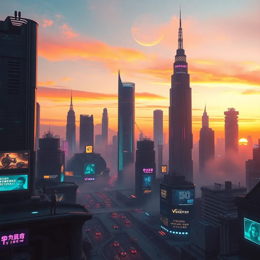 Generate an image of a futuristic cityscape at sunset, with towering skyscrapers, flying cars, and a vibrant atmosphere. Incorporate a blend of neon lights, holographic advertisements, and a subtle misty fog. The sky should be painted with hues of orange, pink, and purple, with a crescent moon shining bright.