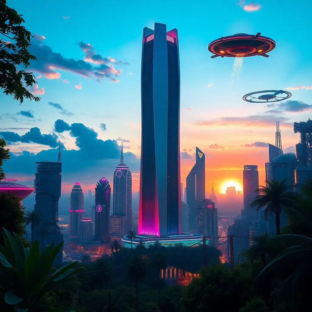 Create a futuristic cityscape at sunset with a blend of organic and metallic structures. Incorporate vibrant colors and neon lights. A sleek, silver skyscraper rises from the center, surrounded by lush greenery and wispy clouds. A futuristic spacecraft is landing in the distance, emitting a trail of sparks.